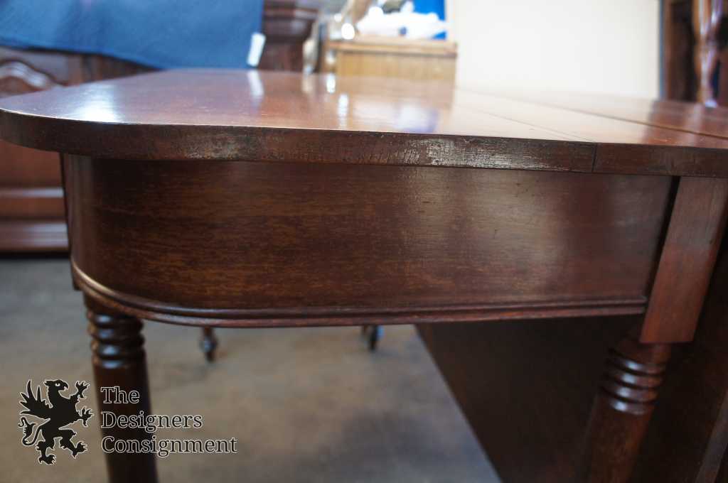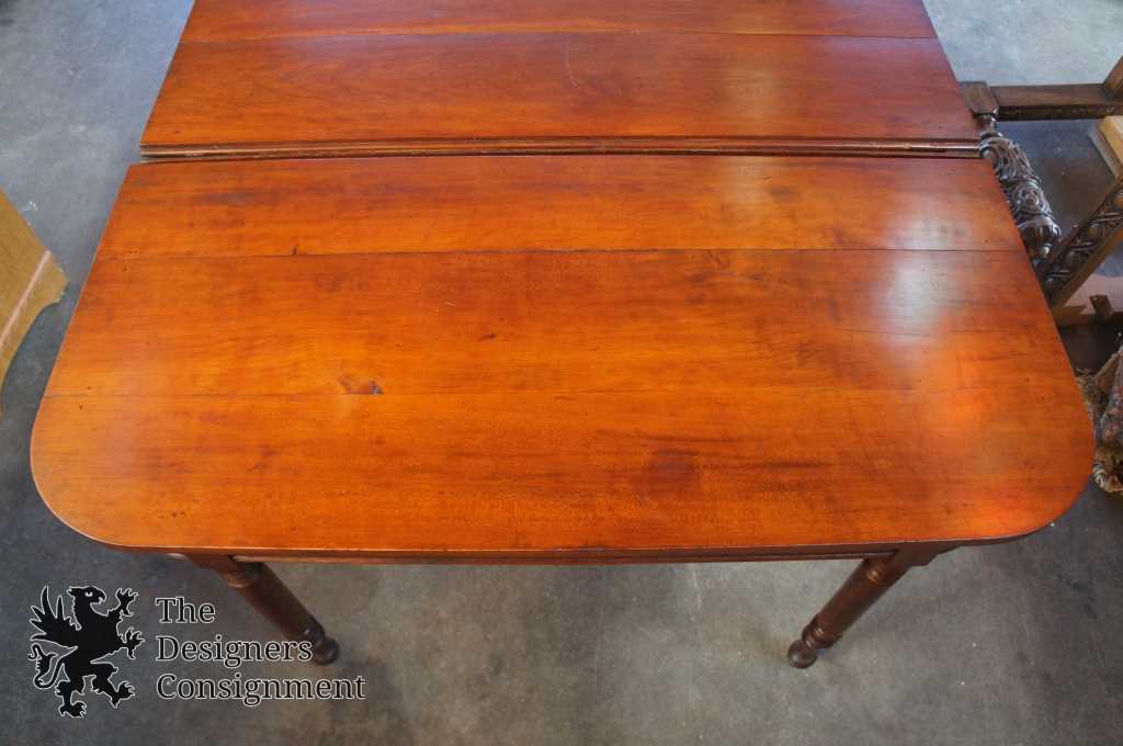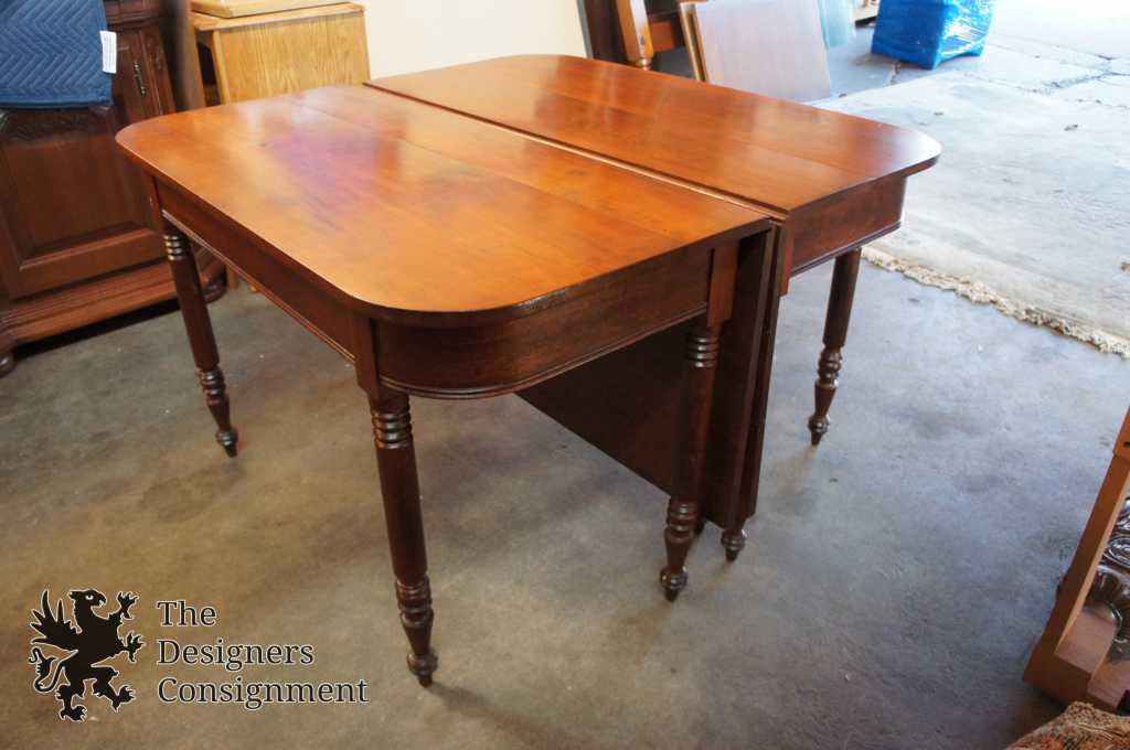 An exquisite 19th century set of Sheraton side tables that combine into one gorgeous banquet table. Made from Cherry with hand turned legs. When apart each side table can be stowed against the wall with the drop leaf hidden behind. To attach the gateleg comes out from each piece to support the central leafs allowing them to come. A great design allowing for multipurpose use.
