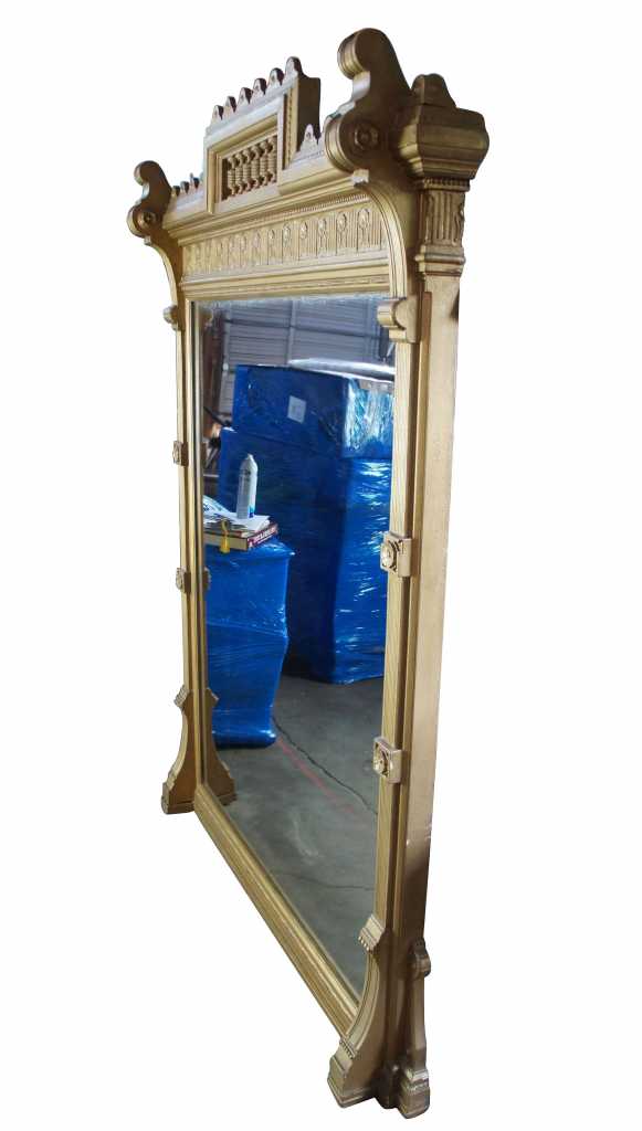 A massive 19th century Eastlake pier mirror with stand. This mirror was made from walnut and later painted gold. The gold could be stripped to bring back the original patina.