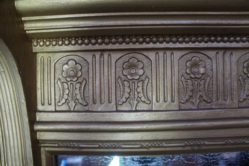 Features an arcade like carving along the top with spindled accents in the center. The frame of the mirror has a fluted construction with intermittent floral medallions. An overall exquisite design that will add grandeur to any setting. The mirror could be hung on a wall or placed above a chest provided ceiling height is available.