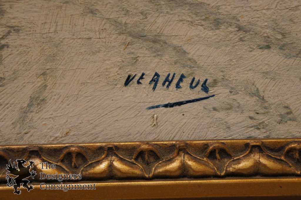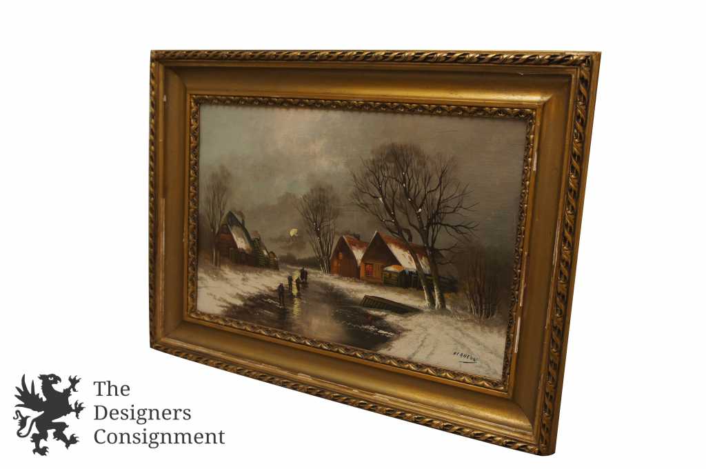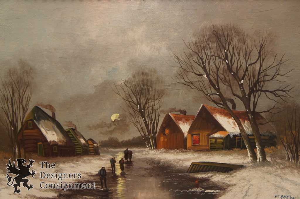 Dutch ladscape painting signed Verheul. The artist Verheul does not have an extensive extensive record, but lived between 1897-1971. This realist piece shows a village after snowfall in the evening. People are seen walking the streets as the moon illuminates the area. Signed and framed. A great addition to any collection.