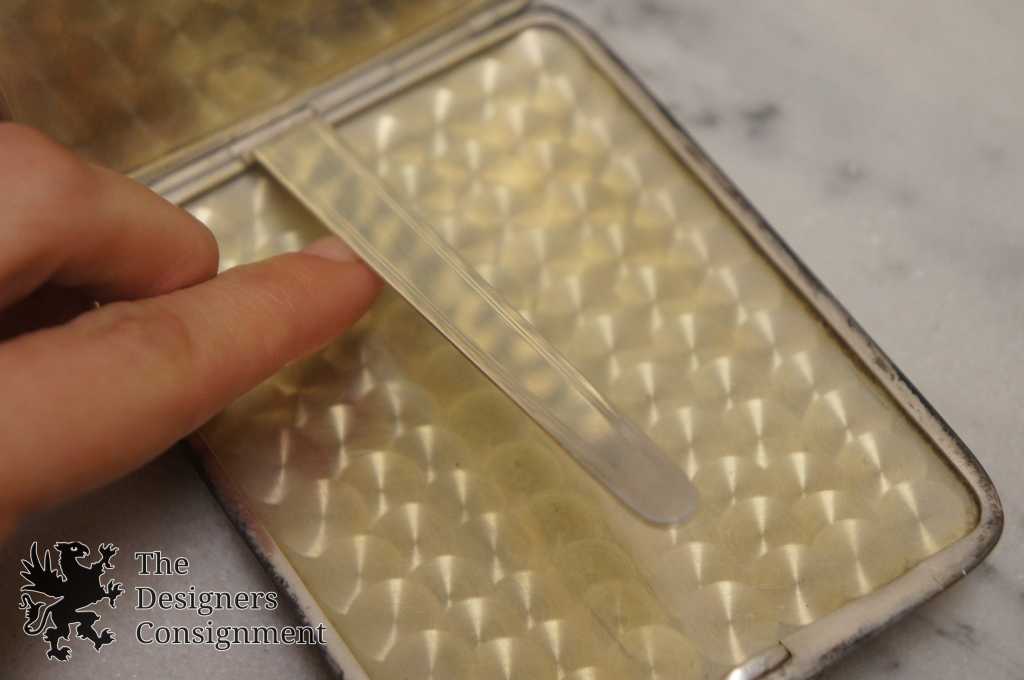 An exquisite sterling case by Napier. The interior is gold washed with a spiral pattern. Exterior has a criss cross engraved pattern.