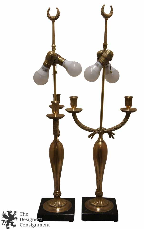 Circa 1995 Alicia (X35417B) brass table lamps by Chapman. Made from brass with regency styling and a marble base. Each lamp features a candelabra design leading up to 2 lights and the finial. When candles and a shade are in place this lamp has the natural appearance of a candelabra.