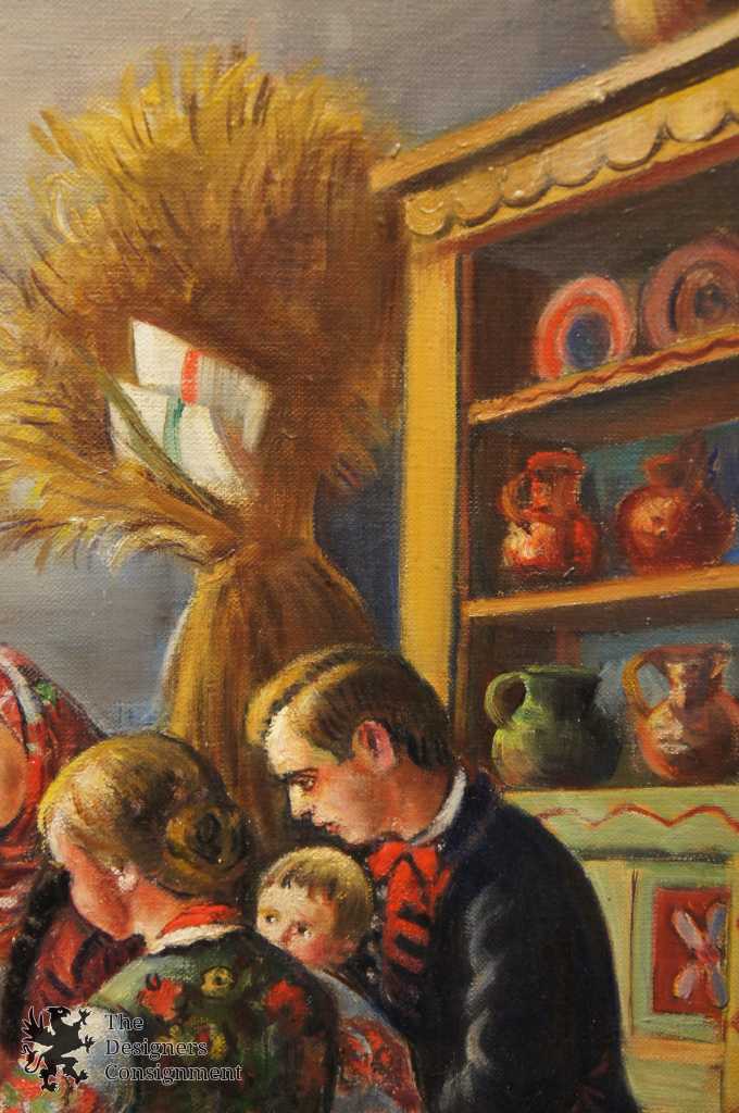 A lovely hand painted winter scene showing a family gathered around the table during Christmas. Features warm colors and attention to detail. The piece is signed along the bottom right, however it appears to be an address. The oil is on canvas, and was painted in Budapest in 1973. A nice addition to any space.