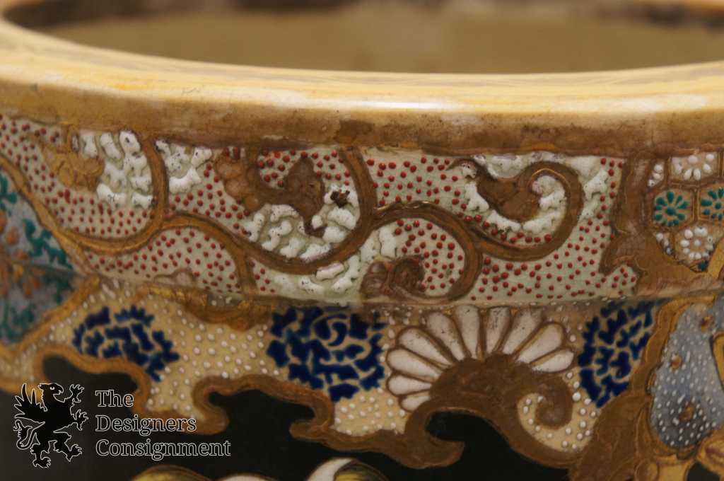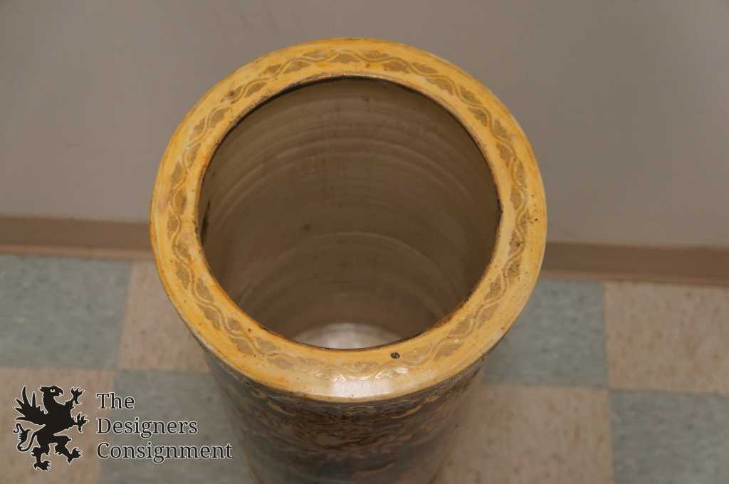 A beautifully designed umbrella or cane stand. Hand painted moonlight bird and floral scene. The piece features crescent shaped handles on both sides. Moriage accents. A great addition to any collection