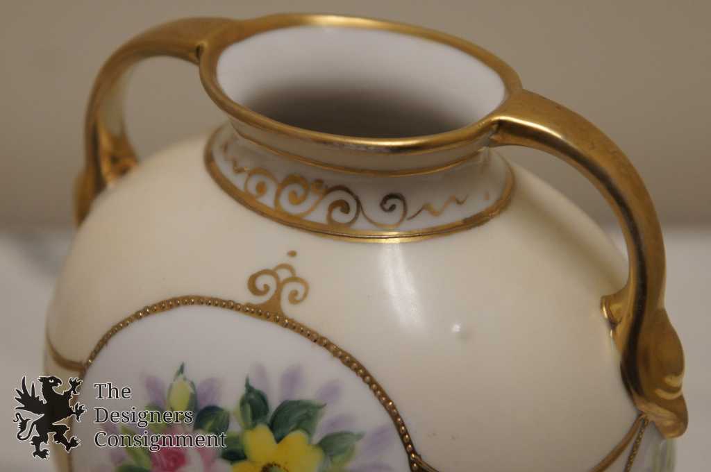 A stunning pair of Nippon vases by Morimura Bros, who began importing in 1911. Creme base with a hand painted floral design within a cameo. The vase gold with a checkered pattern and handles along the top. A great addition to any collection.
