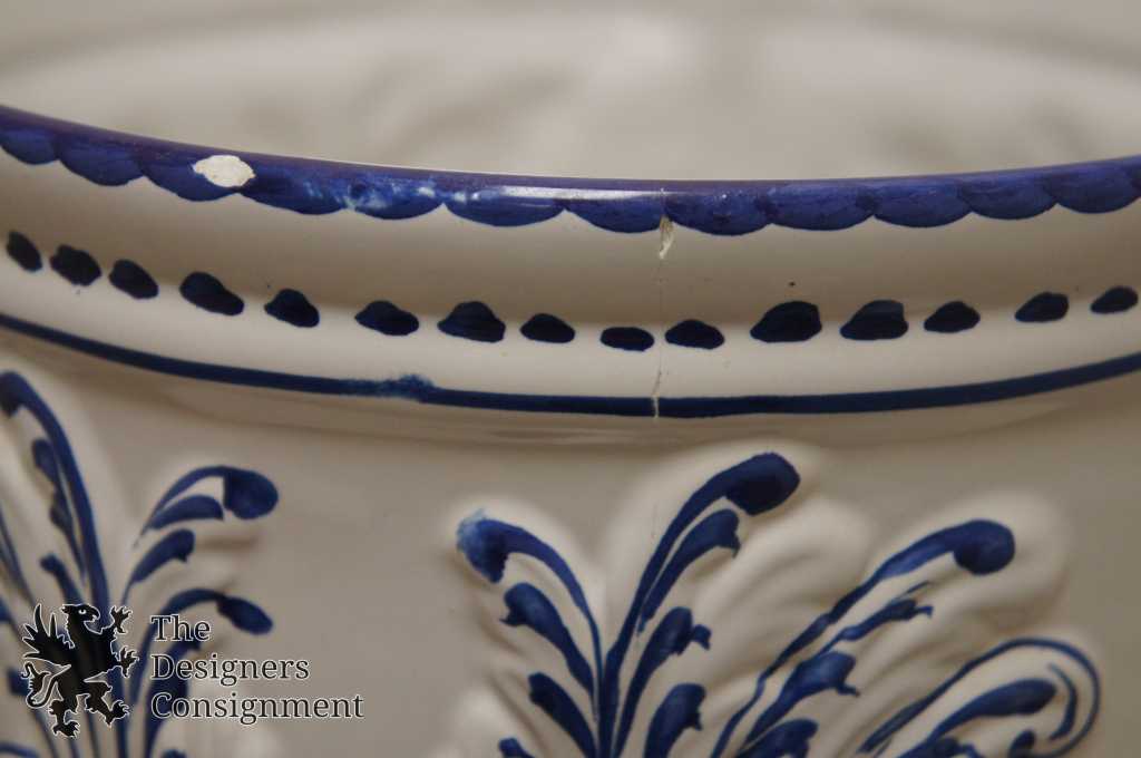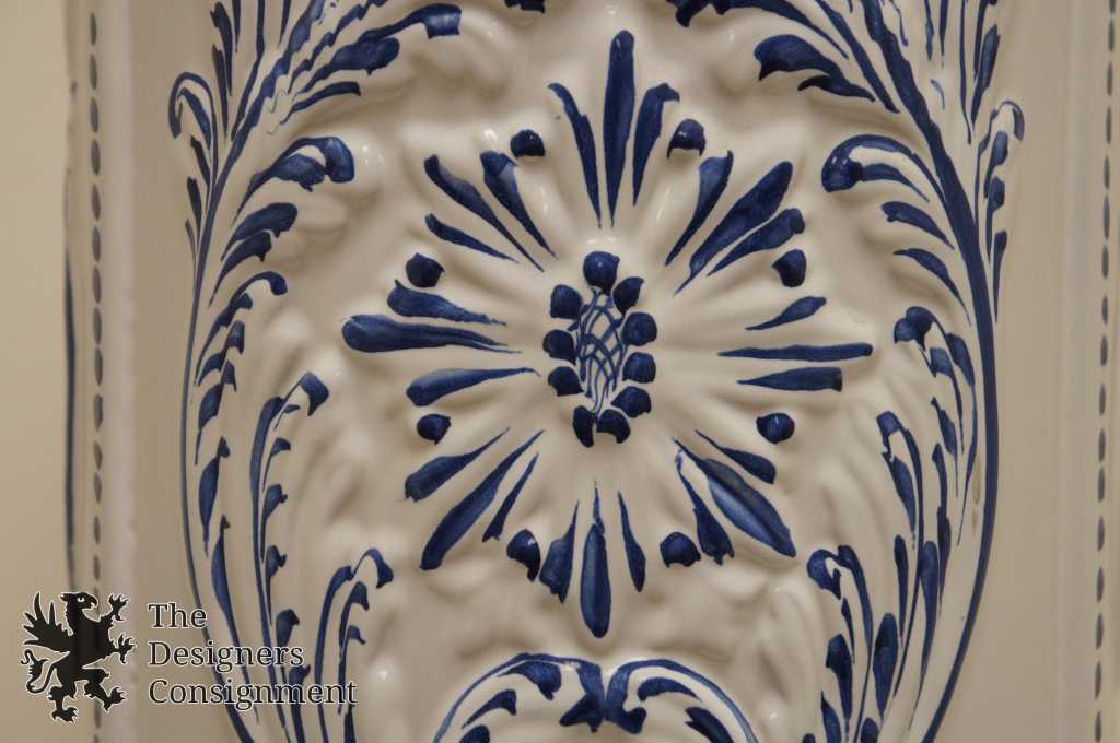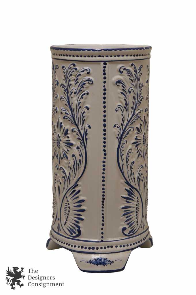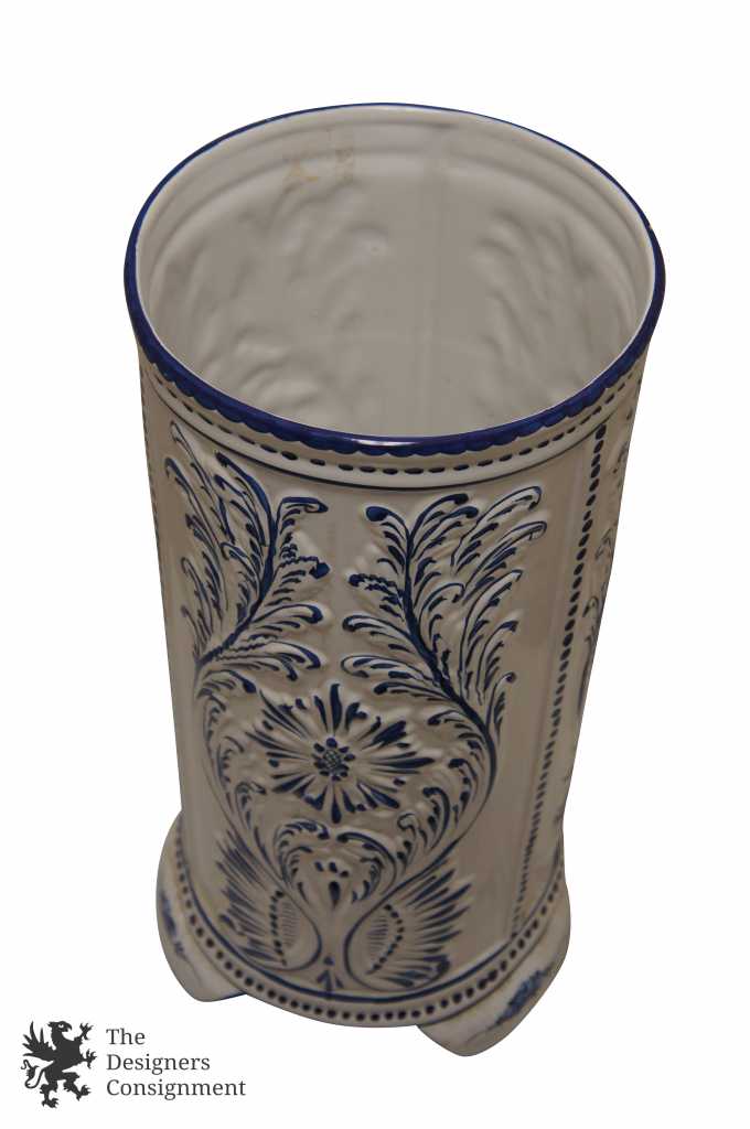 A stunning hand painted Portuguese umbrella/ cane stand. Monochrome with a blue raised floral design over white. Sits upon a tripod base. Signed on the under side.