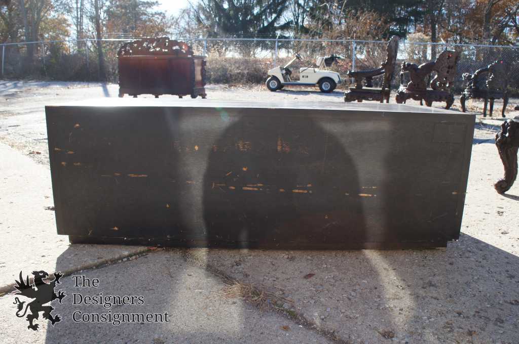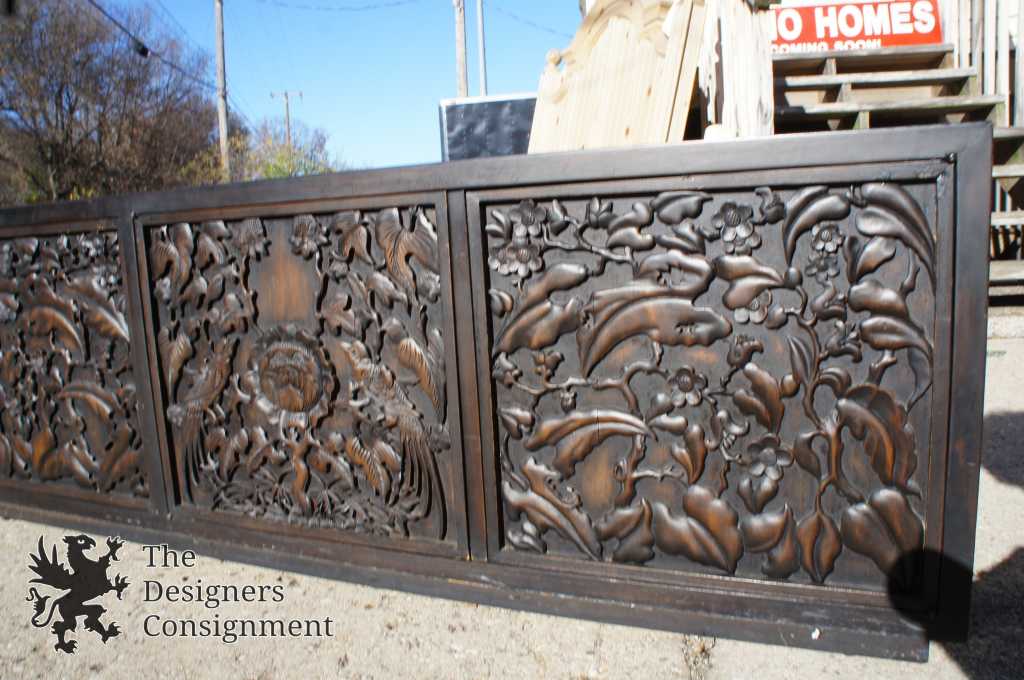 Beautiful 5 panel 3 door caved Asian cabinet. Low profile making it perfect for use as a TV cabinet. Intricately carved with birds in a floral setting. The doors of this cabinet are low profile, so at first it doesn't even appear to open. Once open there are 3 dovetailed drawers along the left and two long shelves to the right. A neat addition to any setting.