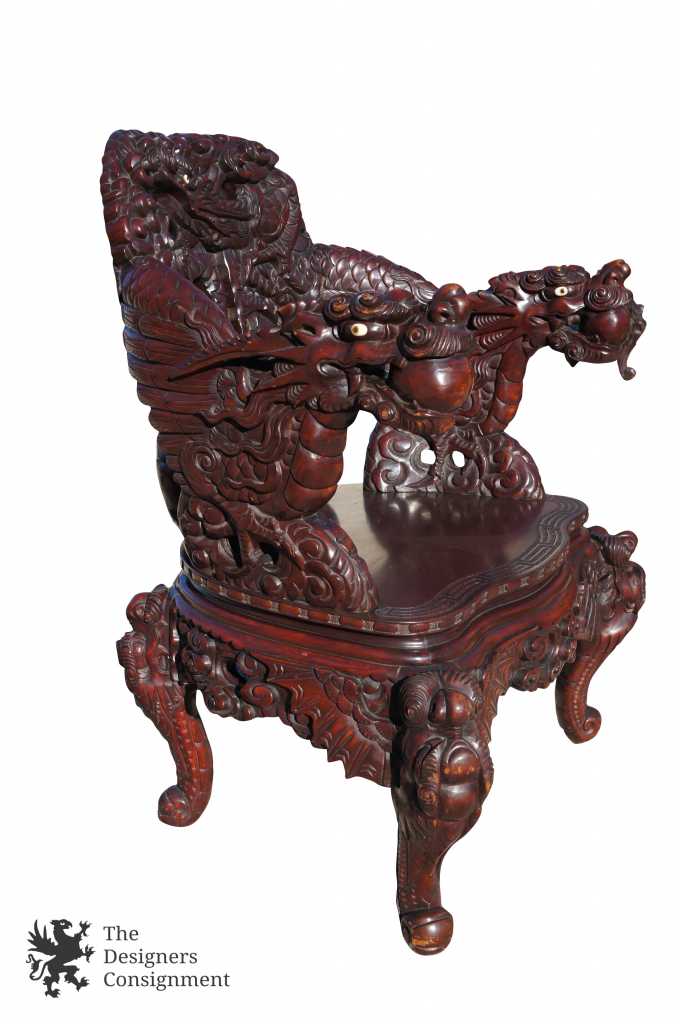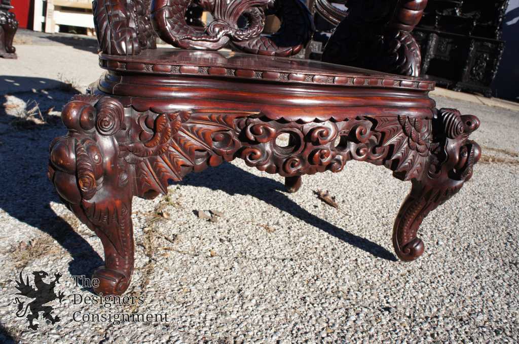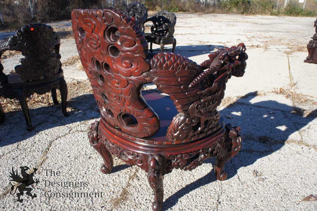 A very large example of a Meiji period Japanese arm chair. Made from from Rosewood and elaborately carved in high relief with a pierced back, coiling dragons, curved arms and winged dragon legs. The seat features a Greek Key band. This is something that is found in a these pieces as the two countries established diplomatic relations in 1899. Quite possibly attributed to master wood carver Tomekichi Suzuki. An overall exceptionally detailed piece that will make a wonderful addition to your collection.