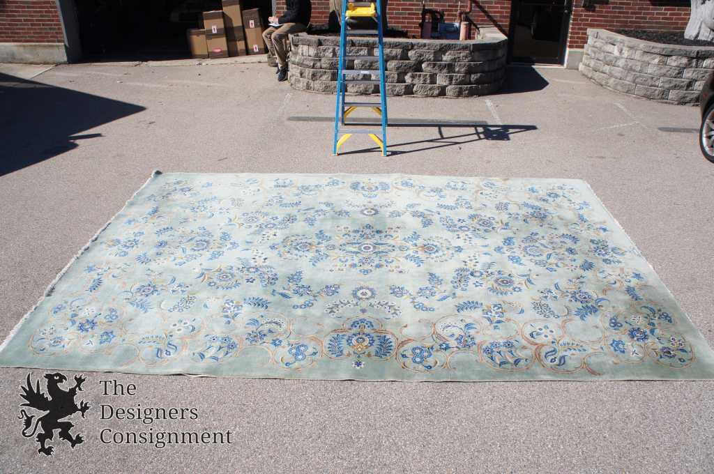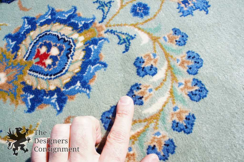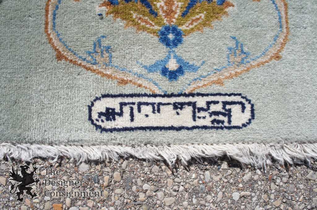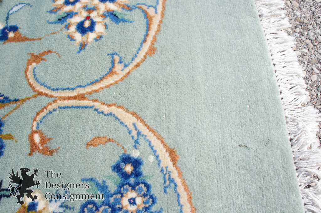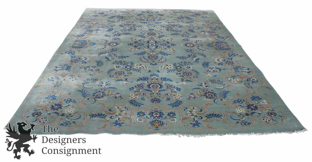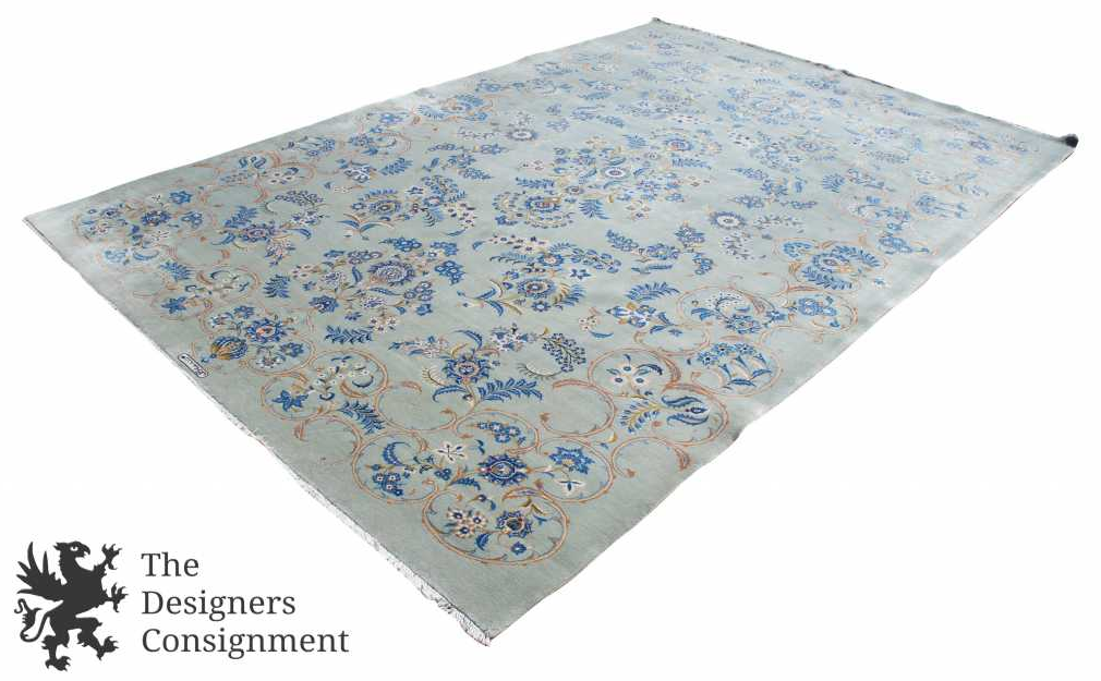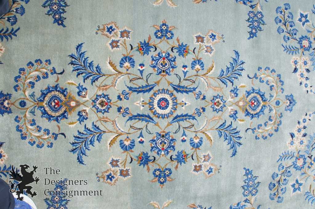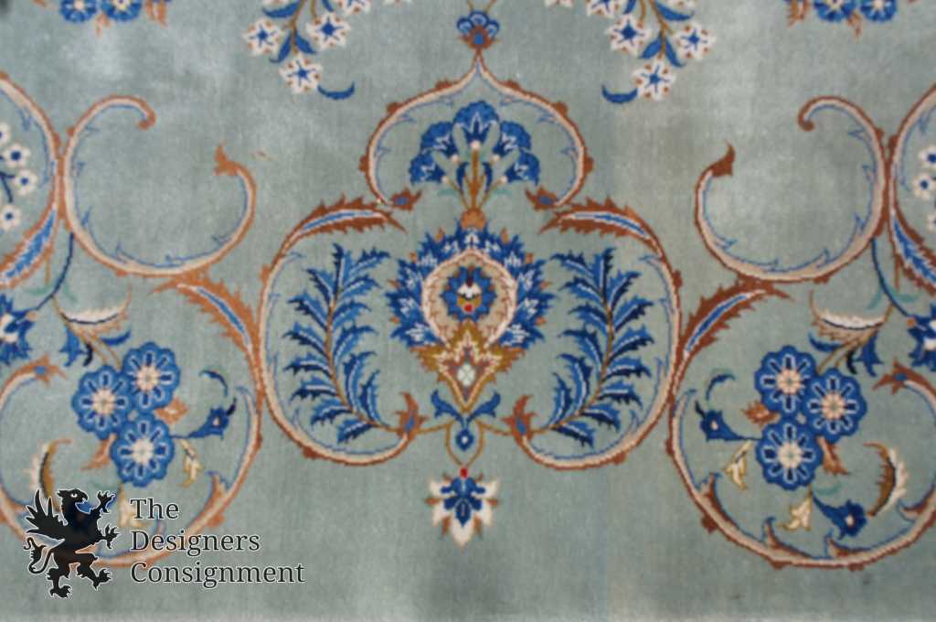 Here we have a beautifully designed floral rug from Kashan, Iran. Signed along the edge. This rug is hand knotted with 100% wool. Turquoise with blue and gold floral design. A great addition to any setting.