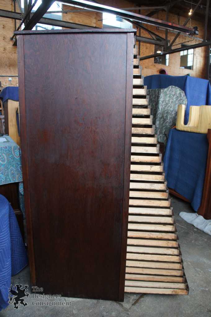 Here we have very unique find. Featured is a 30 drawer Apothecary/ map cabinet. Made from Oak with Iron hardware. Circa mid century. Typically these pieces will be found in about half the size or double the width. The cabinet is 6'7" with very deep drawers. The four side post of the cabinet and drawers are solid oak, while the side and back paneling are veneer.