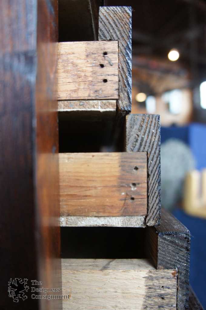Good overall condition. Some marking and distressing from use. Veneer damage along the bottom edges of the base from being moved around over the years. One of the drawers has different hardware, and another is missing its iron handle portion. In the photos these are seen as the very top and bottom drawers. In addition there is some chipping to the bottom of some of the posts.