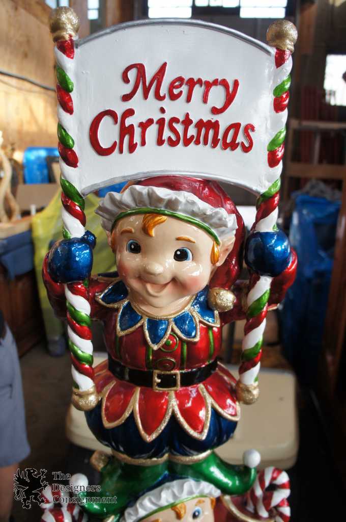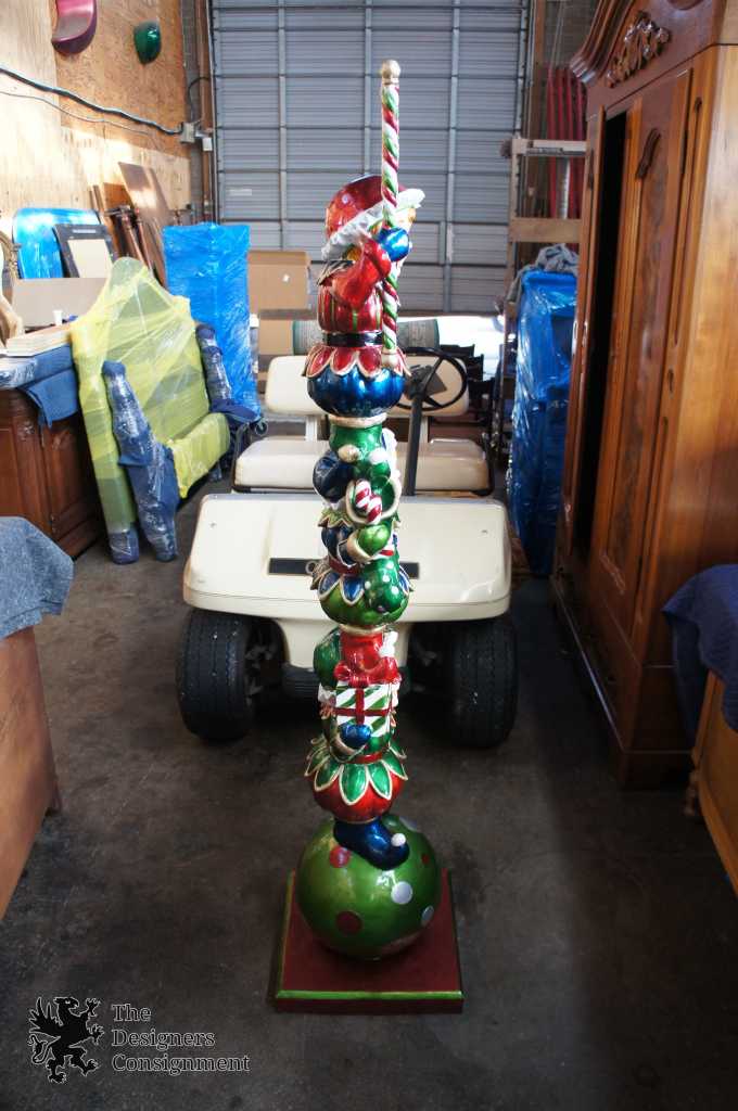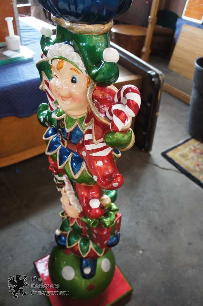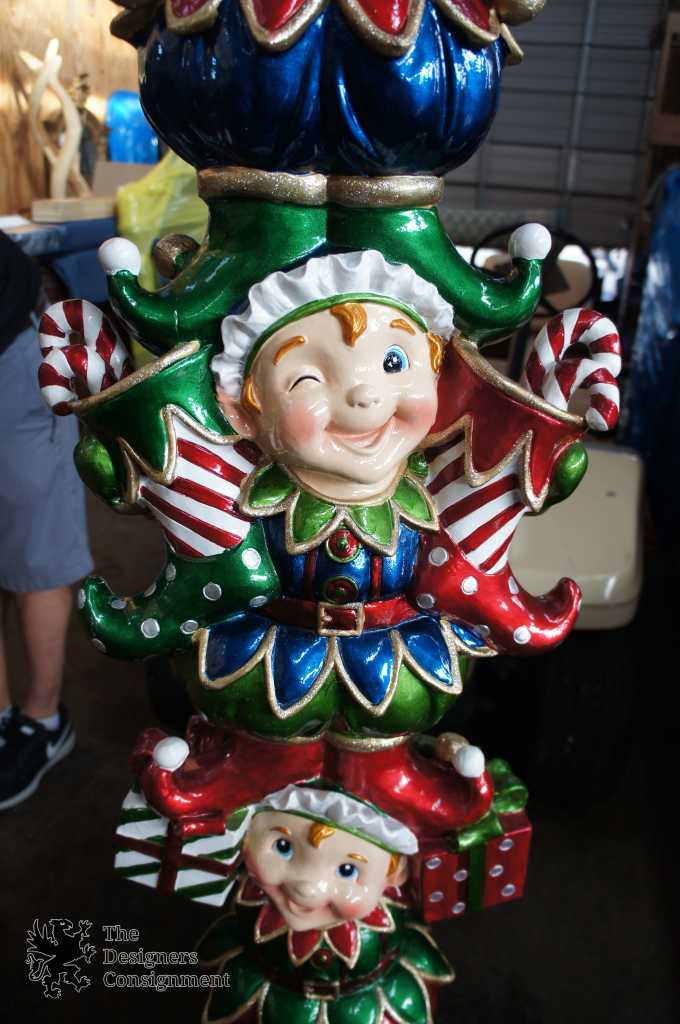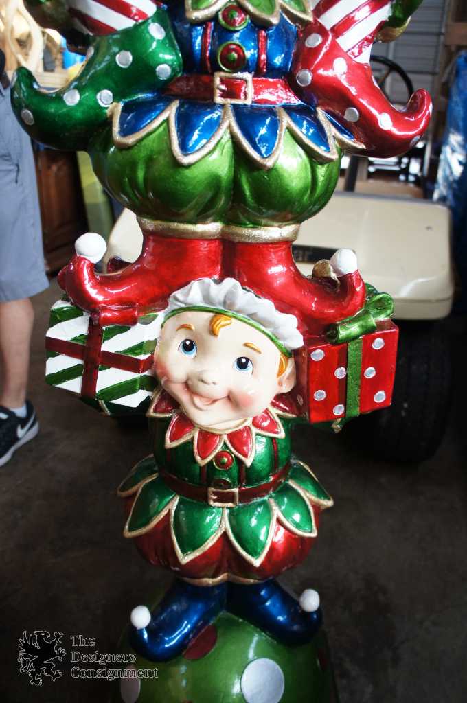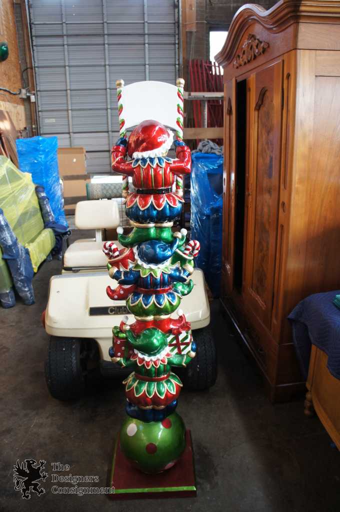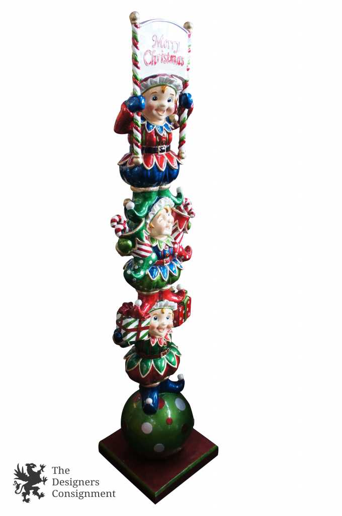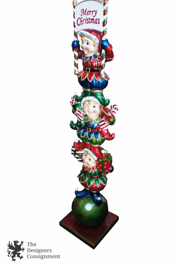 A 6-foot display of gleeful smiles and high-gloss metallic finishes, The Elf Totem Pole could coax a smile from even the grumpiest holiday guest. The ideal doorway accent is outdoor-safe and three-dimensional - highly detailed with bow-topped presents, gold-trimmed costumes and plenty of polka dots and candy-cane stripes.