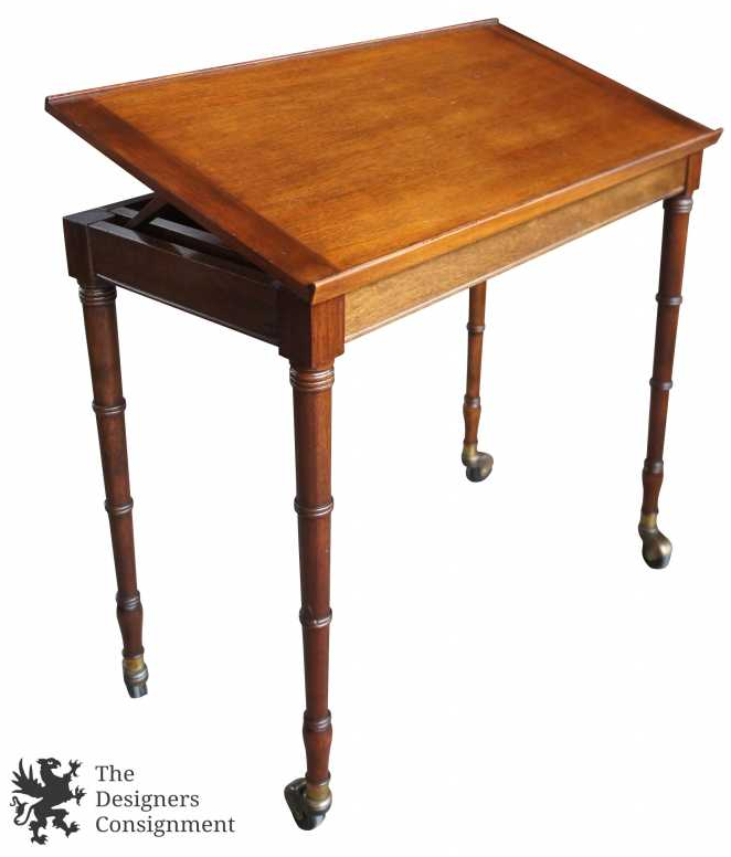 Up for consideration is a mid century campaign desk or stand. Made from Mahogany with a great design. The top is podium style and lifts to a slant that can be set to 3 different angles. Underneath there is space for storage. Legs are turned with casters for ease of movement. Legs are also removable. A unique piece for any setting!