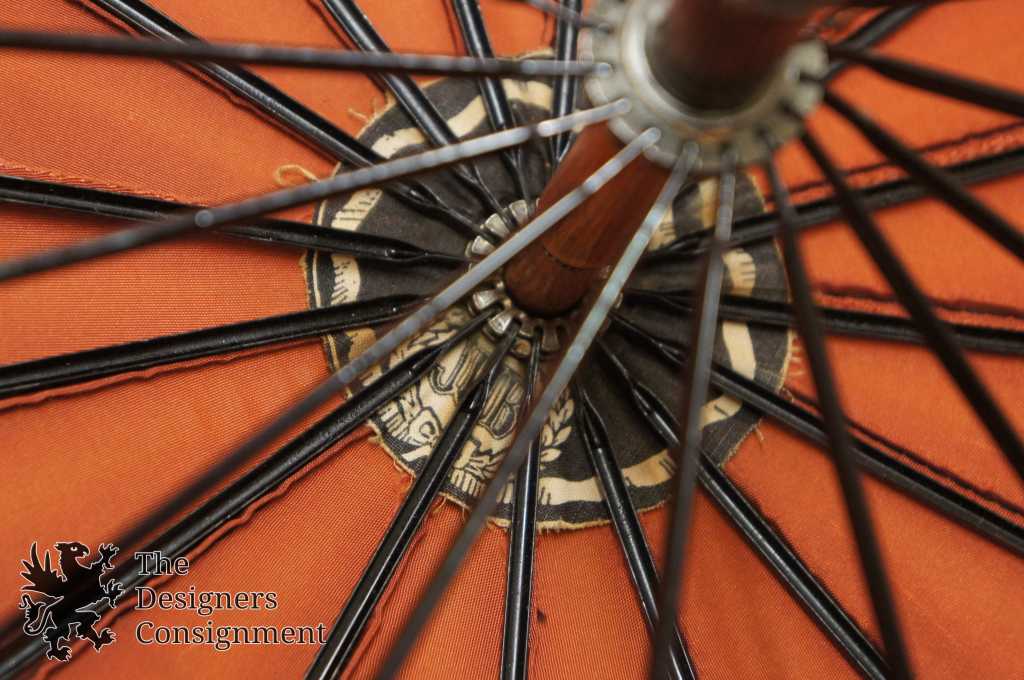 Antique Rust Orange Umbrella with Carved Wood Handle Jack Rabbit Head Parasol