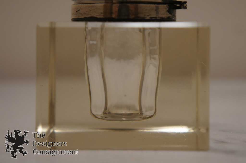 2 vintage art deco inkwells. The round one has a neat optic glass pattern with a plated top in high relief. The cubed one has a sterling ring with a geometric art glass design.