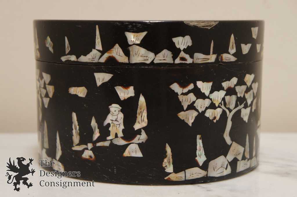 Beautifully designed antique Chinese lacquered mother of pearl tray and box. Each piece is features an intricately detailed scene.