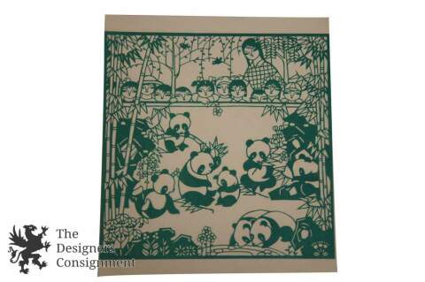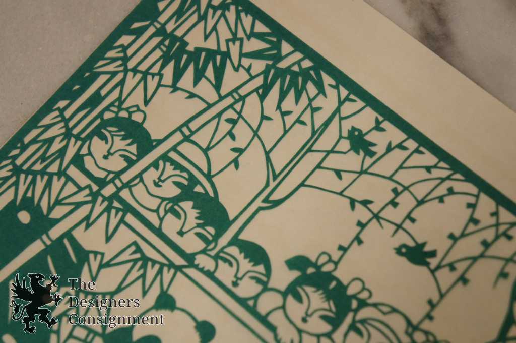 A whimsical Chinese paper cut out showing a zoo scene with pandas eating bamboo while school children watch from above. Comes with a sleeve that is marked.
