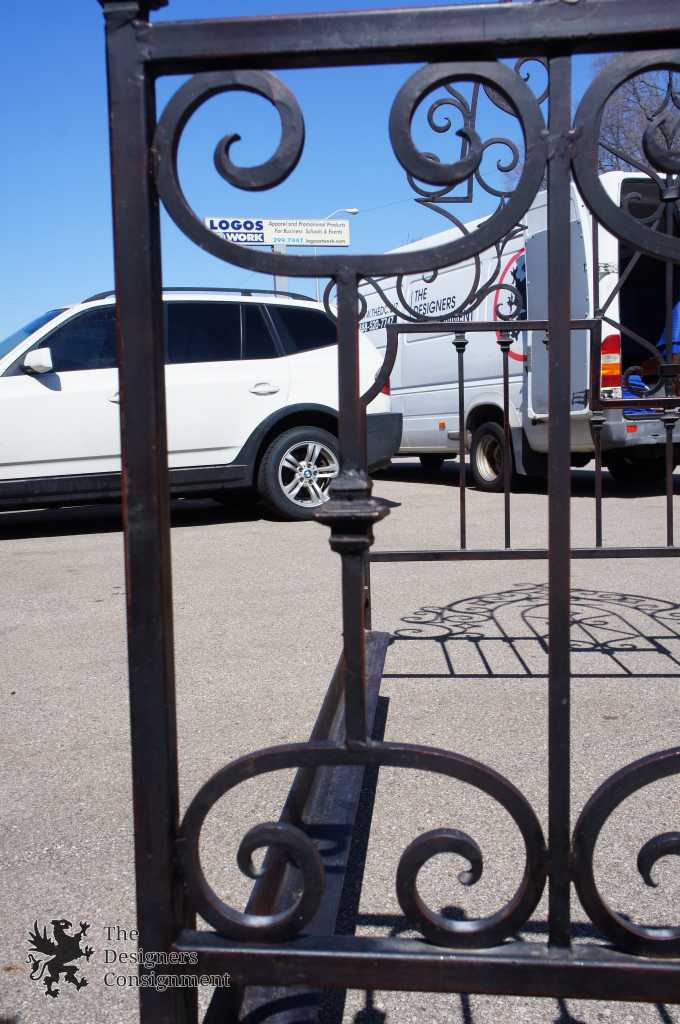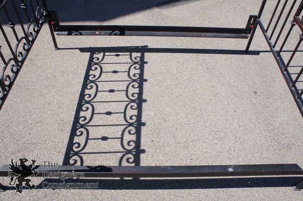 An Arhaus queen size wrought iron Gothic bed frame. This unique frame has wrought iron scroll work and diamond pattern designs with an old world finish of red under iron. A neat Addition to any setting.
