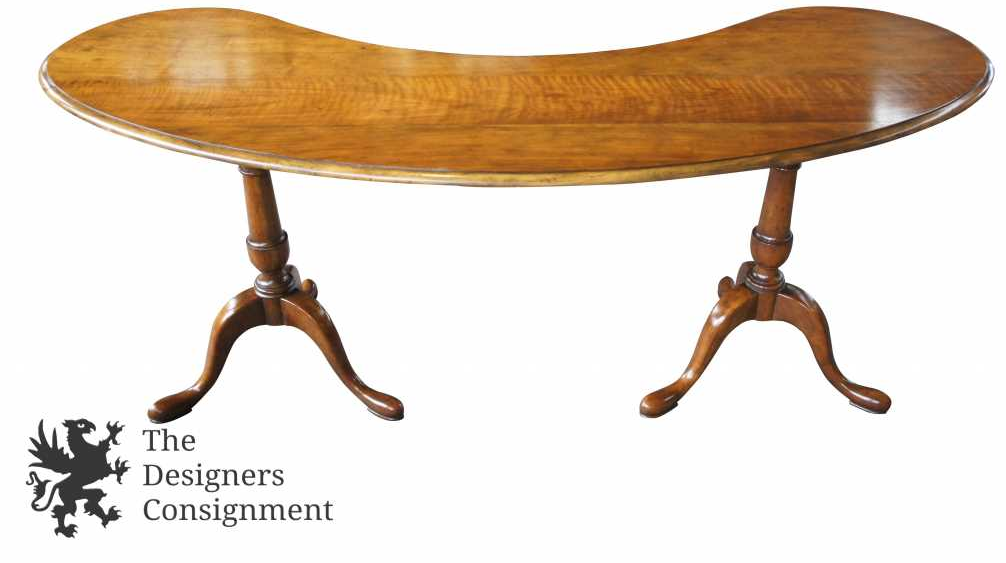 Up for consideration is a gorgeous solid walnut desk by Baker Furniture. Kidney Bean/ Crescent shaped with amazing color and grain pattern. The desk is supported by two Queen Anne pedestals with slipper feet. This relatively lightweight and easy to move around. Could double as a console or serving table.