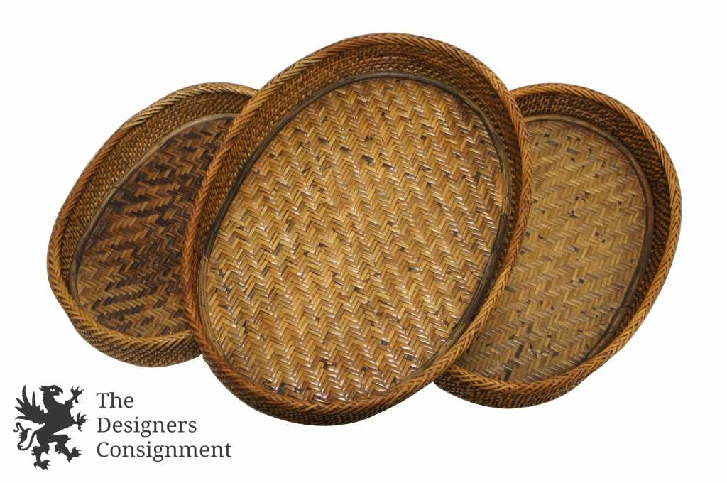 These beautifully woven rattan baskets feature a wooden bottom and neatly nest for storage. Great for display.