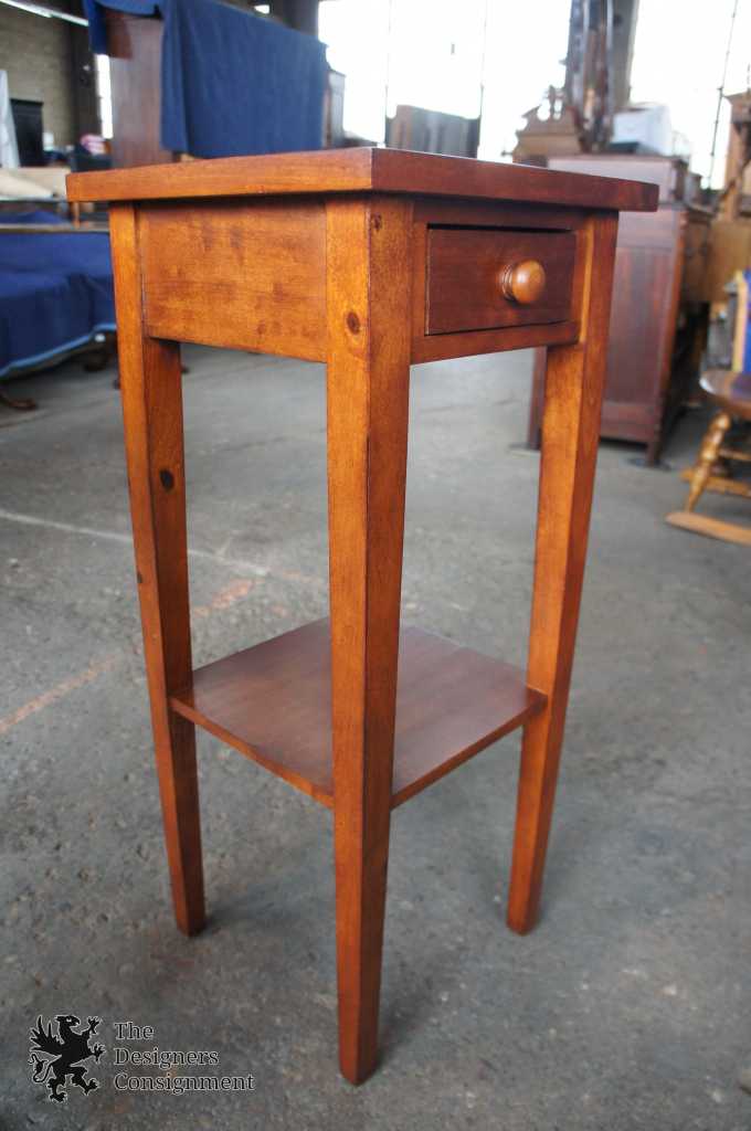 A neat pair of lightweight nightstands. Made from pine with a tiled top. Each features a dovetailed drawer and lower shelf. Legs taper towards the floor.