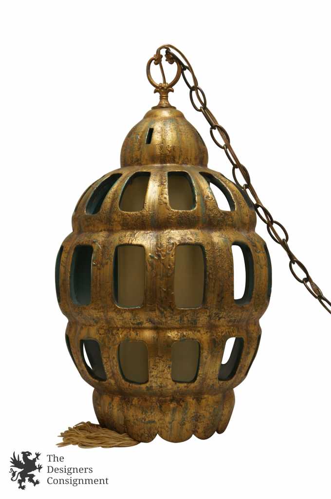 Up for consideration is a beautiful Hollywood Regency style swag lamp. Circa Mid Century. Pierced cage design. Distressed Gold with Green undertones and a tasseled switch. A neat addition to any setting.