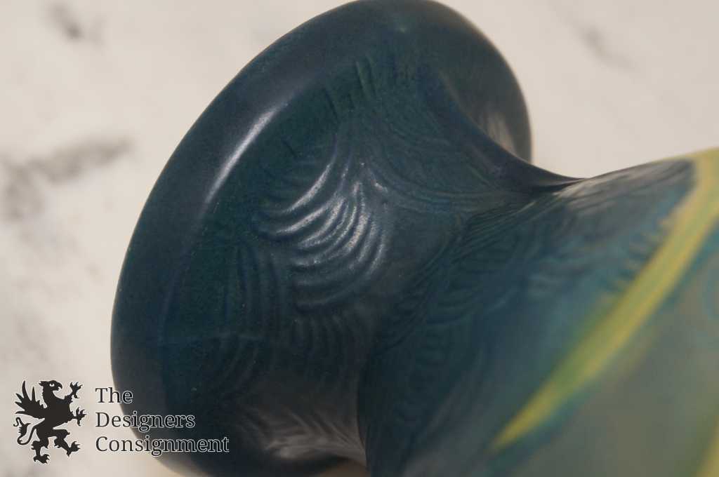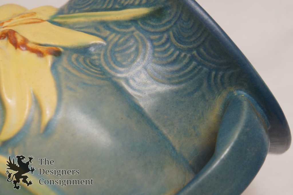 A beautifully detailed vase. Textured blue with lilies. This piece has a great mold and bold color.