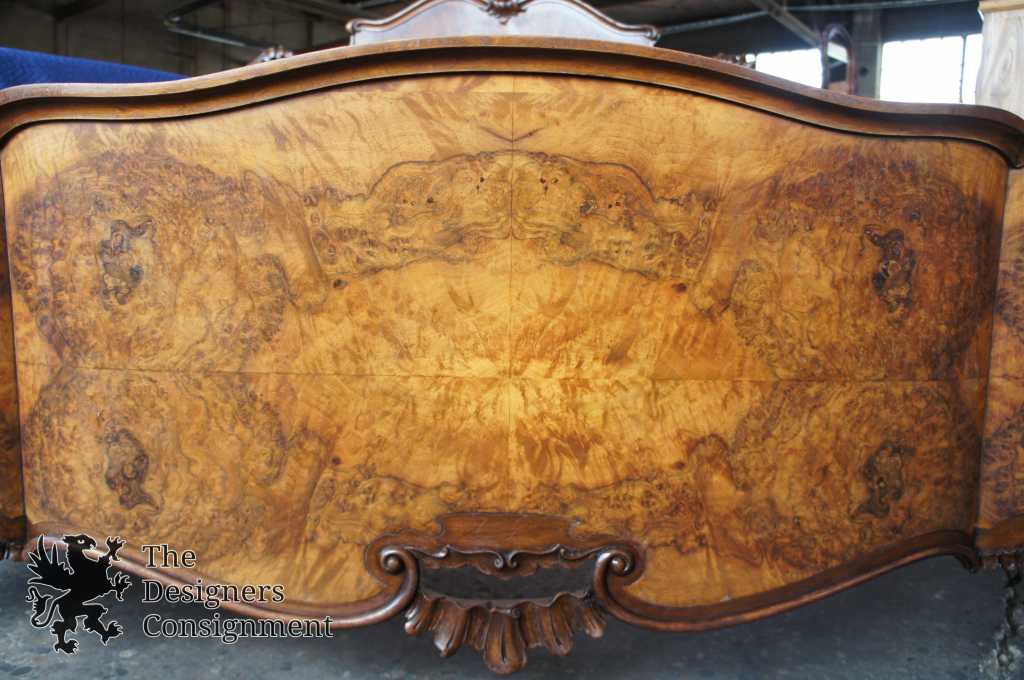 Up for consideration is a monumental Walnut burl-wood bed frame. Circa 1850s. The veneer is match-booked giving off gorgeous tones. Baroque style with scallop carved accents. This bed are Imported from Italy in the 1990s. Original purchase tag available.