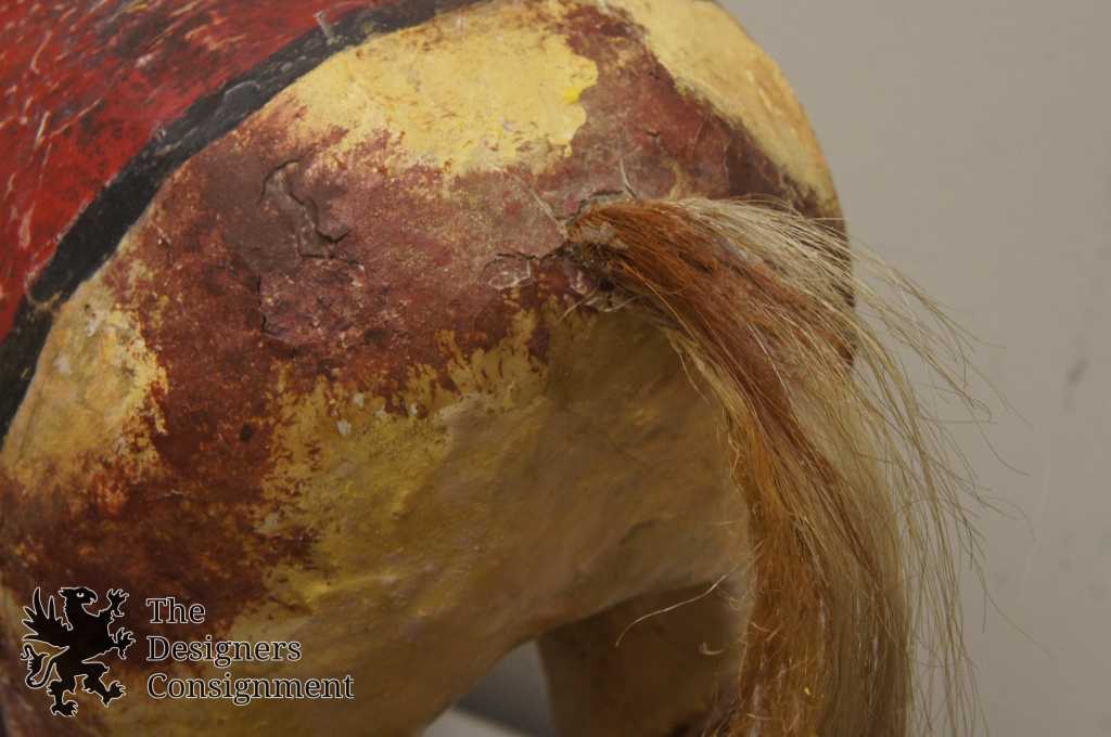Up for consideration is a rare antique Papier Mache pull toy. Generally these horses are around 12" long, yet this one is close to double that size. Meticulously detailed down to the leather ears, paint and tail. Circa 1880-1920s. The horse is mounted on a wooden base. The wheels are still functional. A neat addition to any collection.