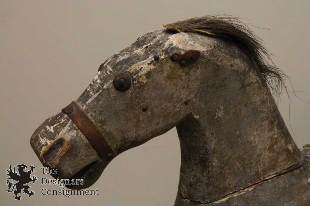 A beautiful late 19th century handmade rocking horse. Painted gray with leather saddle seat. Ears and strap around nose are also leather. The eyes are made from what appears to be cast iron buttons, which can also be found accented the seat. The horse is mounted to a wooden base. A remarkable piece that will make a neat addition to any collection.