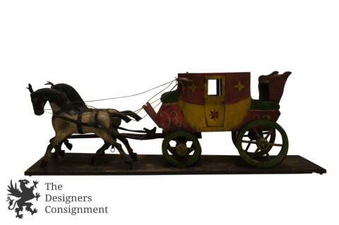An Early 20th Century Horse Carriage. Hand Carved & Painted in beautiful color and detail. Both doors are functional. The carriage has been mounted onto a base for display.
