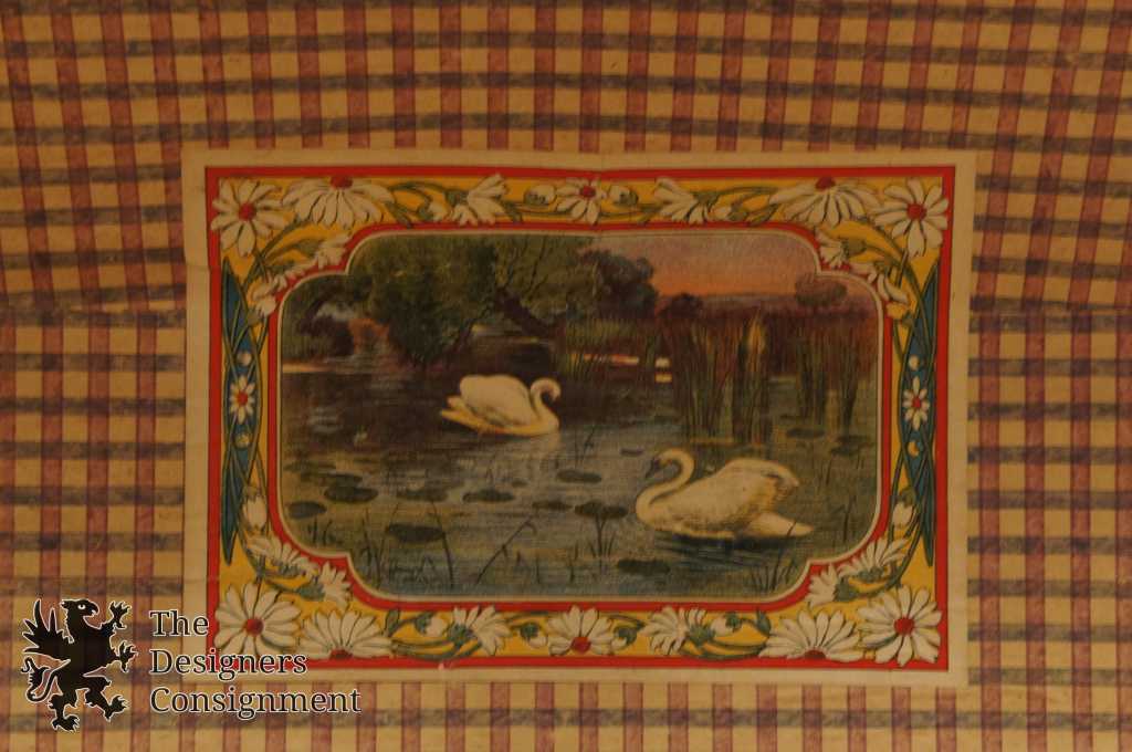 Beautifully designed miniature Victorian trunk with compartments. Marked 1872 in pencil along the bottom. Paper lined in plaid with swan litho along the inside of the top. Features a pull out compartment with additional side storage. Brass Banded with latch. A neat addition to any setting.