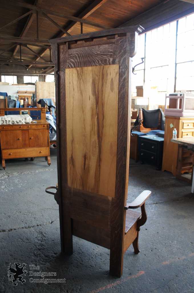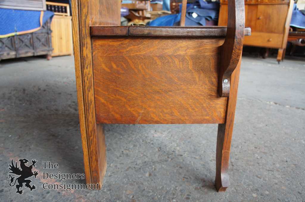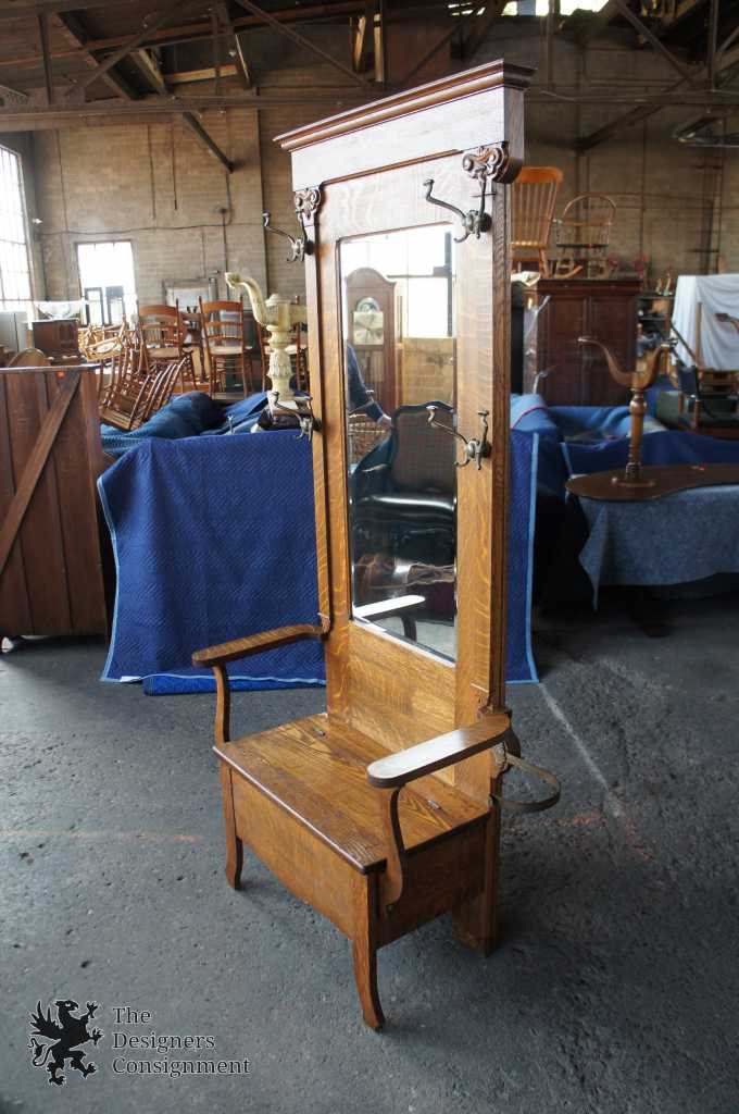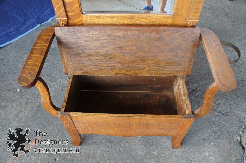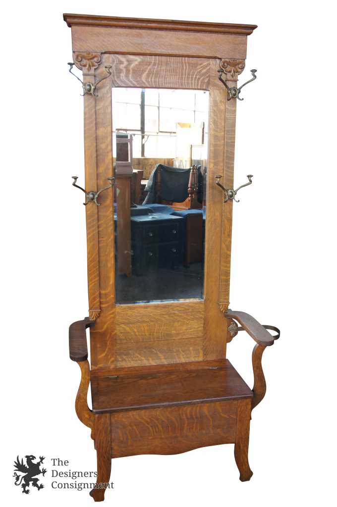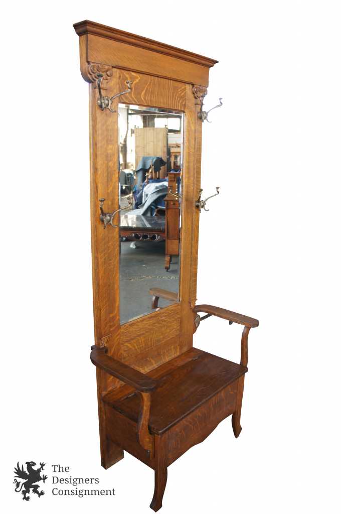 Exquisite turn of the century hall tree. Made from Quartersawn Oak. Features a beveled glass panel, ornate thick hanging cast iron hooks, umbrella holder, and carved trim. The bench seat lifts up for added storage. The perfect piece for any entryway. Seat Height - 18.5