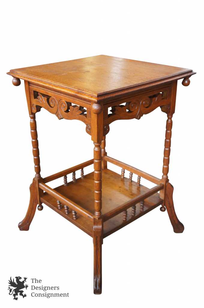 Exquisite 2 tier Victorian side table. Eastlake style with beautifully scrolled detail. Made from quartersawn Oak. Features ribbed legs, drop finials and floral engraved accents. A neat addition to any setting.