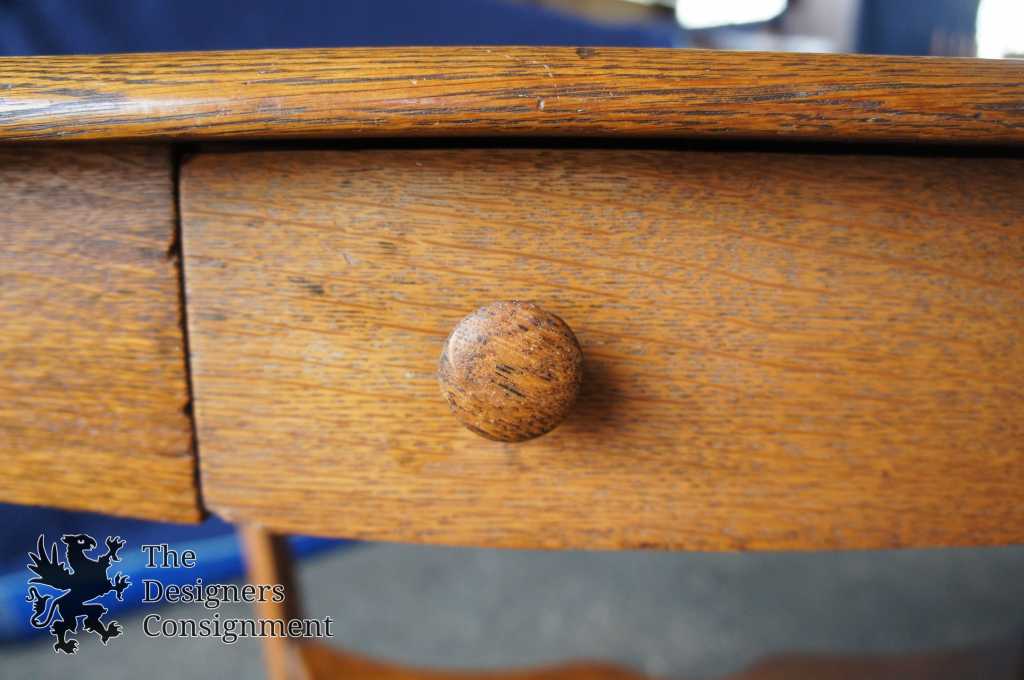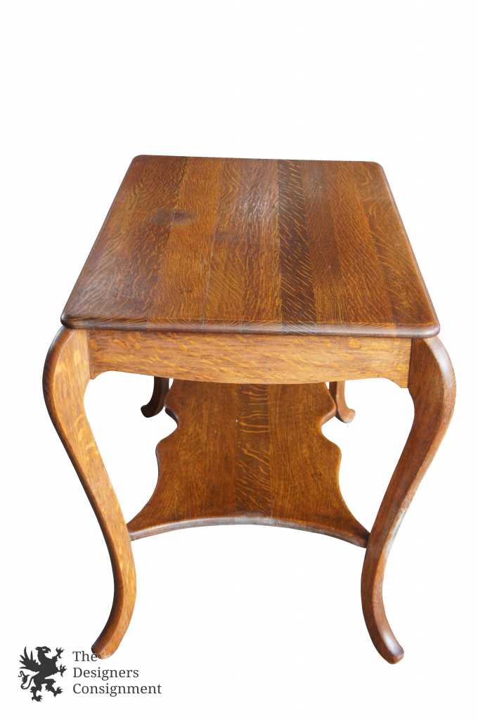 Early 20th century quartersawn oak library table with cabriole legs and lower shelf. The legs of this desk and lower shelf can be removed for ease of moving or storage.