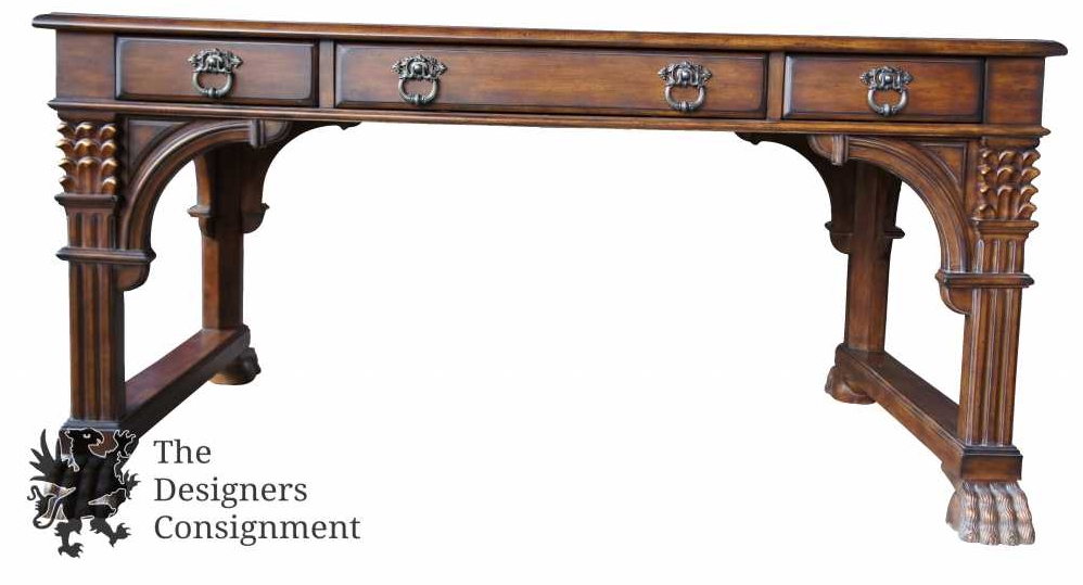 Exceptionally detailed antiqued reproduction office desk. Features a distressed mahogany finish with 3 panel tooled leather top. Each leg has a column like design with acanthus relief towards the top. Legs are connected by a stretcher from front to back and mounted over paw feet. A neat piece that will make a statement in any setting.
