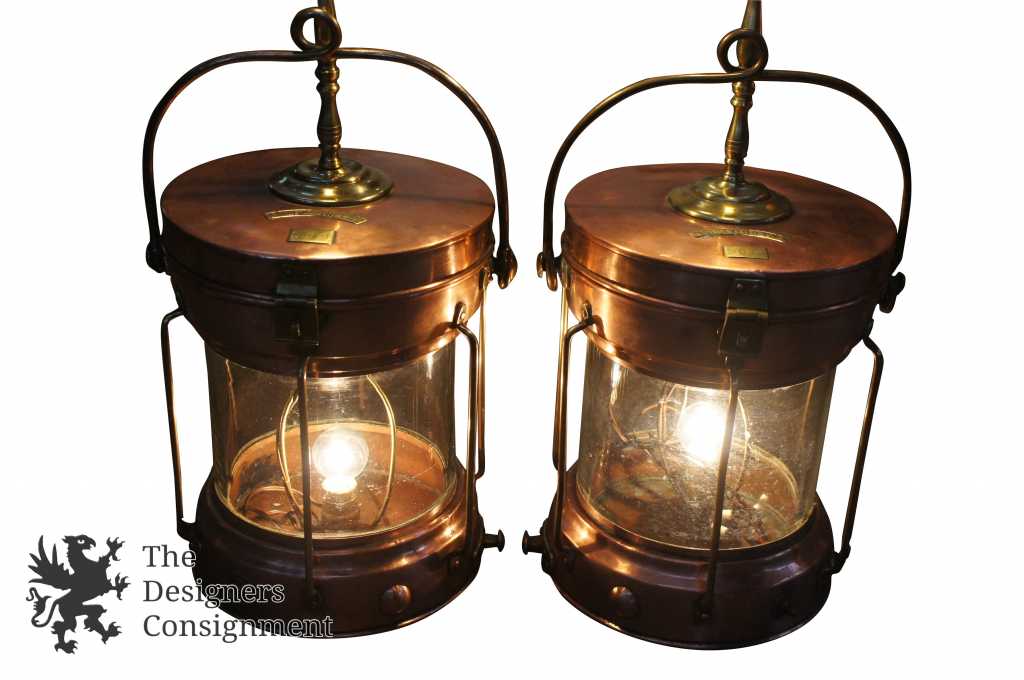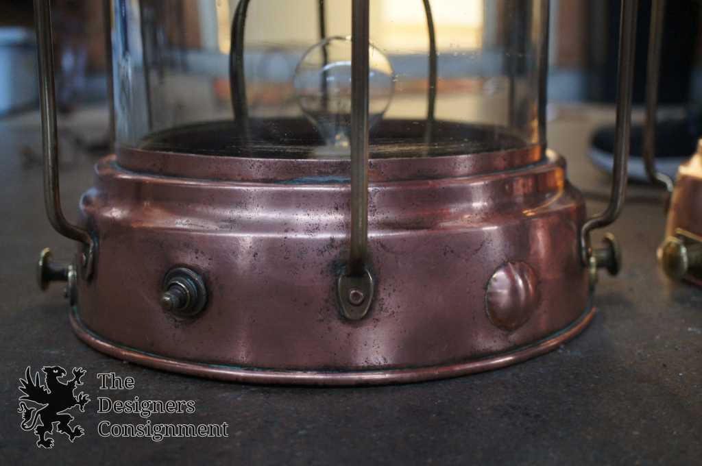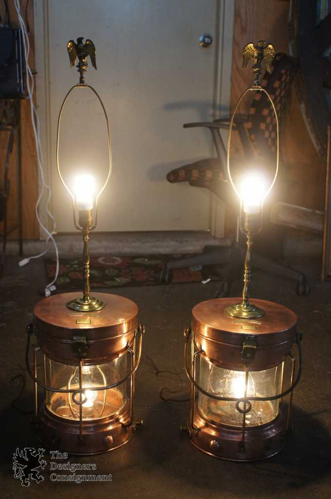 A beautiful pair of nautical lanterns. Each is marked the "Maritime" B 988. The lanterns are made from copper with brass accents. Each has been converted to a table lamp with an interior and upper light and accompanying finial for shades.