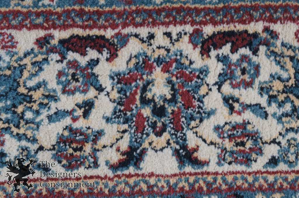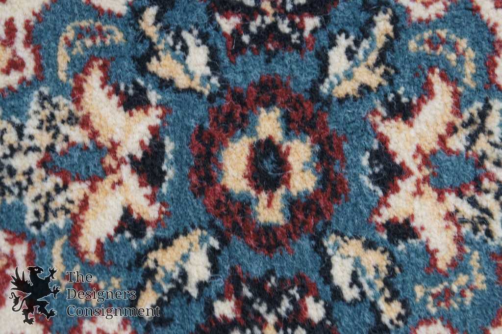 Traditional Persian/Oriental machine made area rug. Features a geometric design with animals (Phoenix, Birds, Deer). Predominantly reds and blues. In the picture there is a shadow that is appearing as a circle on the rug. This is not damage, just a reflection.