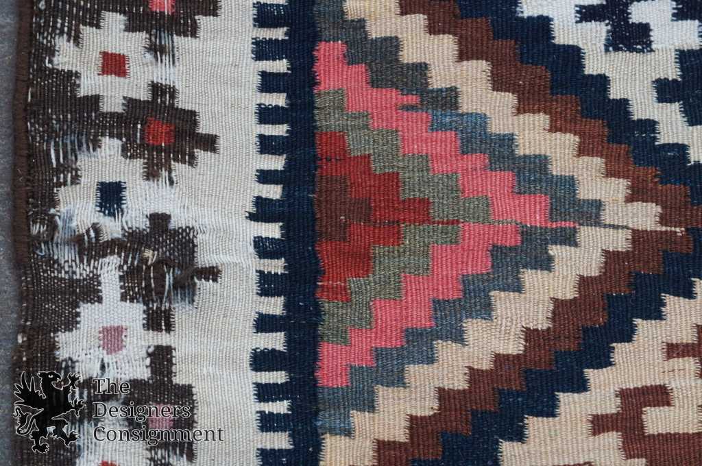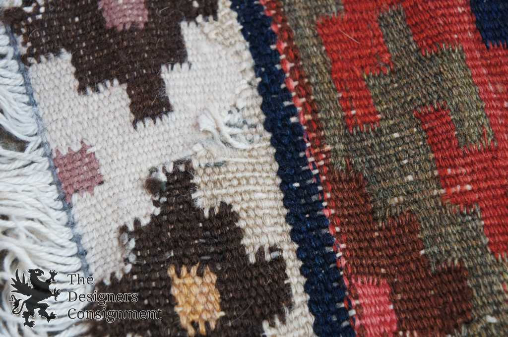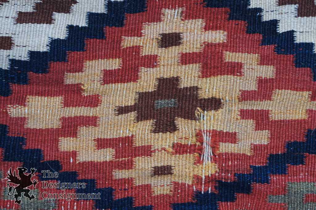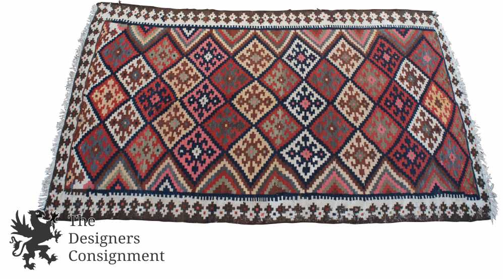 Semi-Antique Geometric Tribal Kilim Rug. Made around the city of Shiraz an Iranian providence known for its tribal weavers. This beautiful piece shows a neat diamond pattern with an exceptional use of colors.