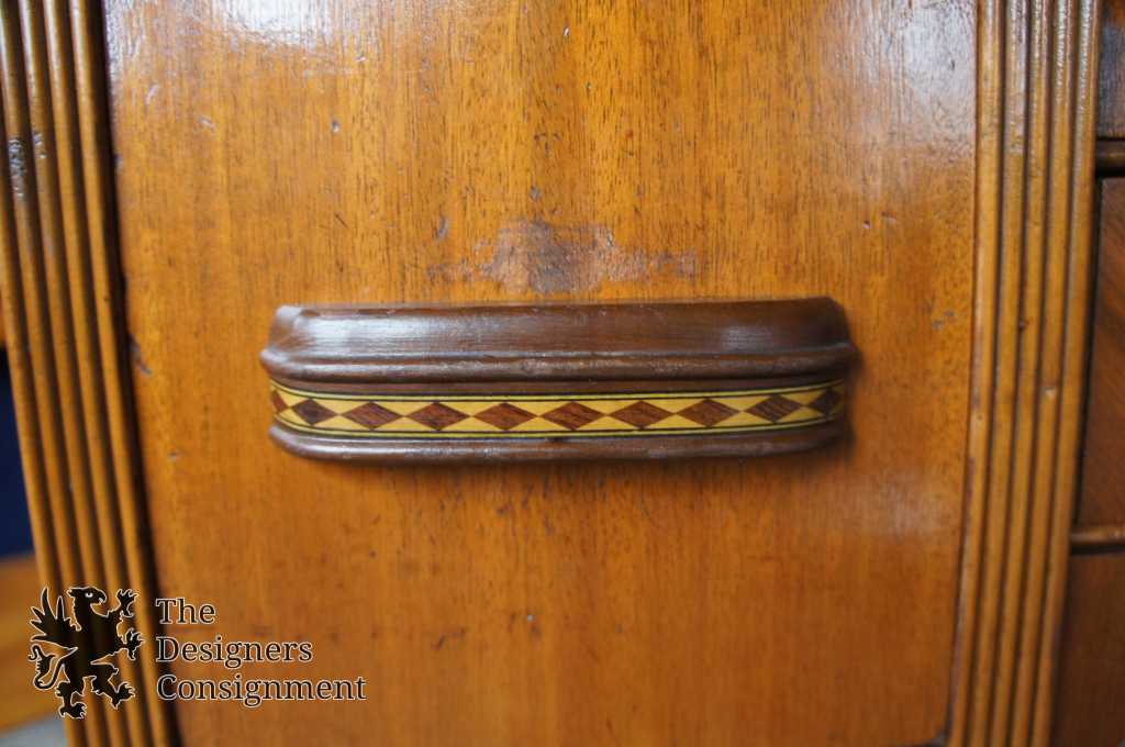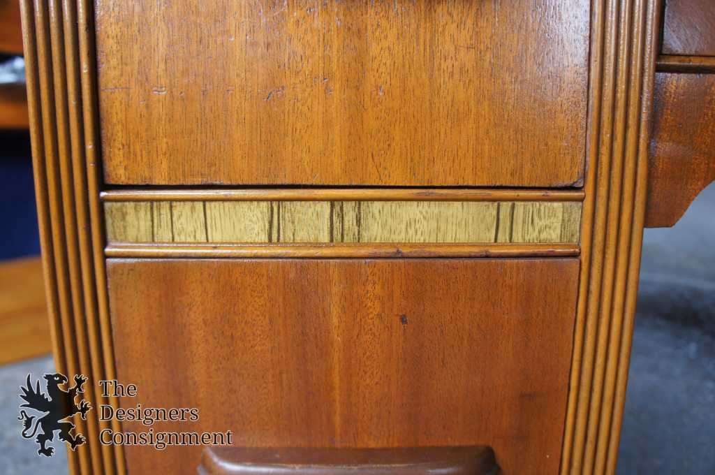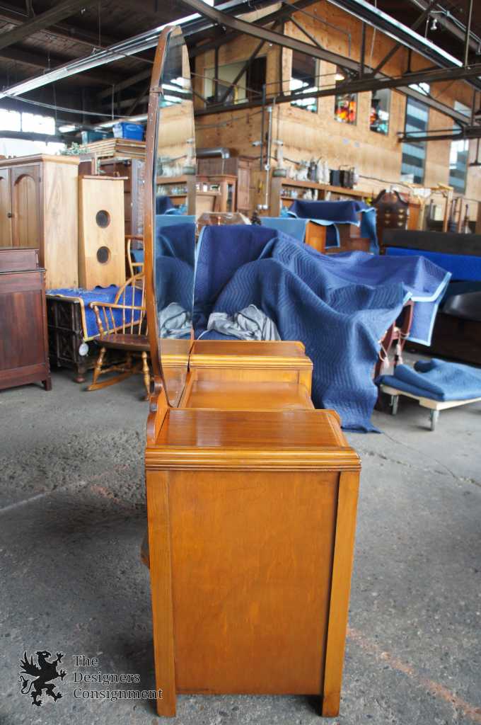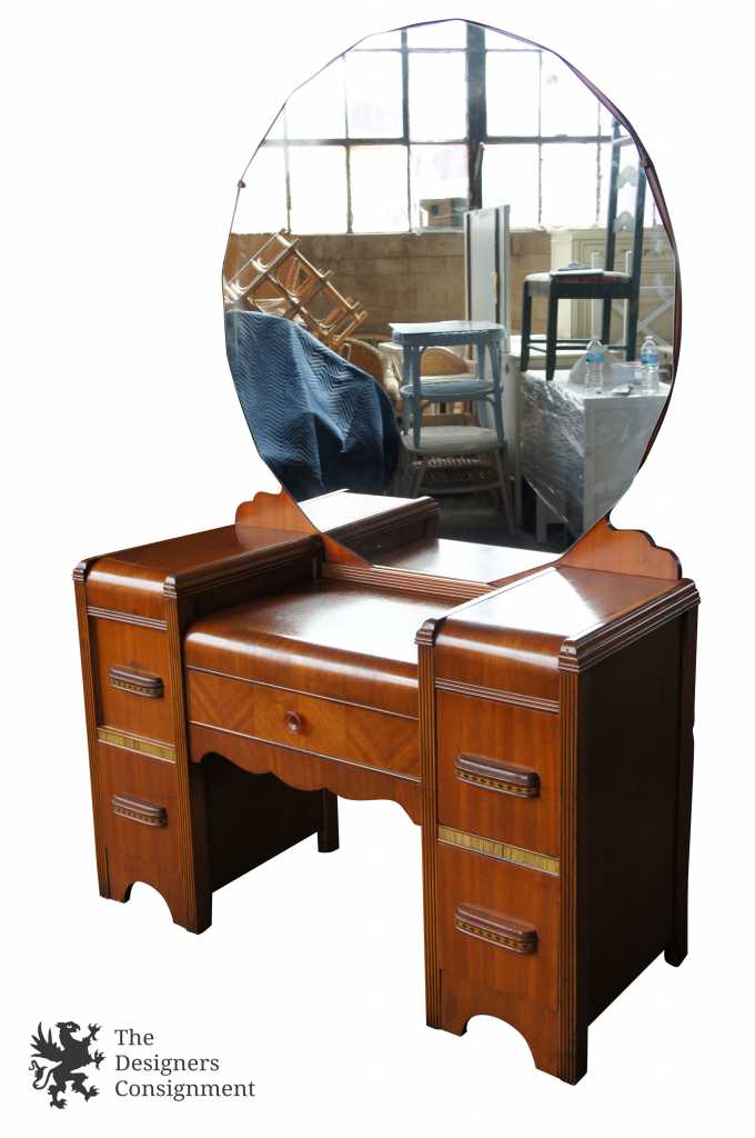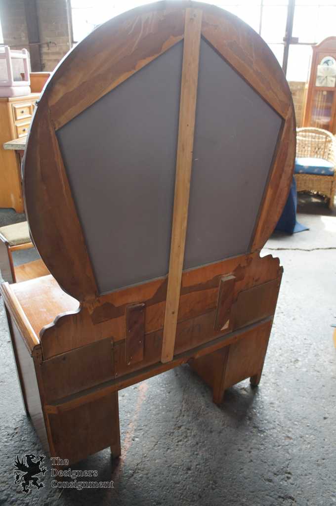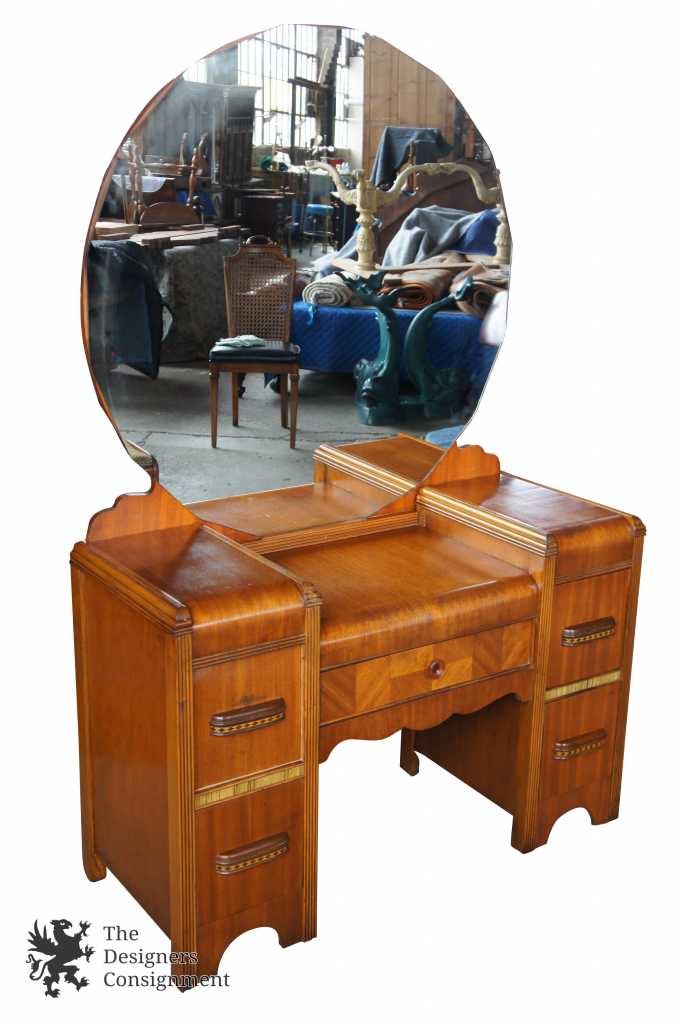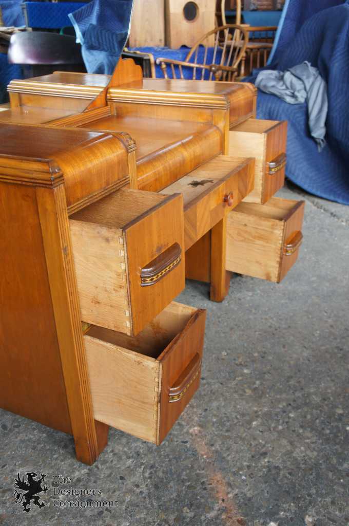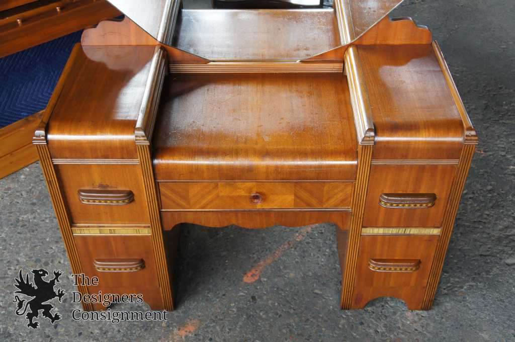 Beautiful antique waterfall dressing table. Features a rounded mirror, 5 drawers and bench seat. Made from walnut with a unique horizontal inlay. A great addition to any setting.