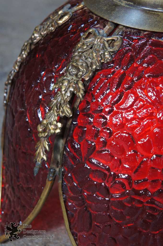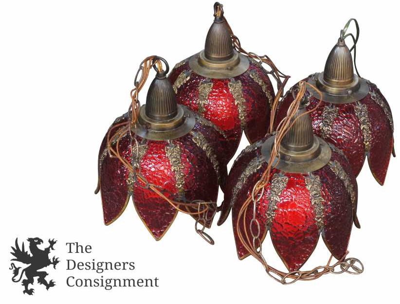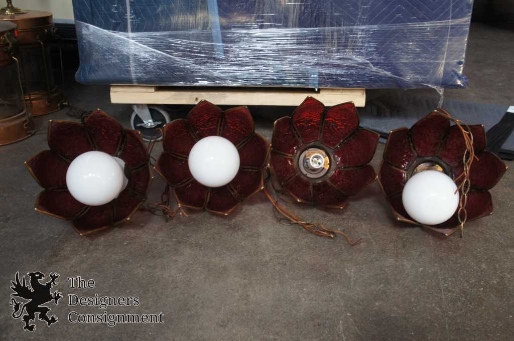 A neat set of 4 tulip lights. Circa mid century. Made with pebbled glass and floral embossed brass trim. These lights hung at the Oakwood club bar in Dayton, Ohio when they opened in 1962. The club is still open, but has since switched to amber glass versions of the same light. These lights will make a great addition to any bar/ pub setting.