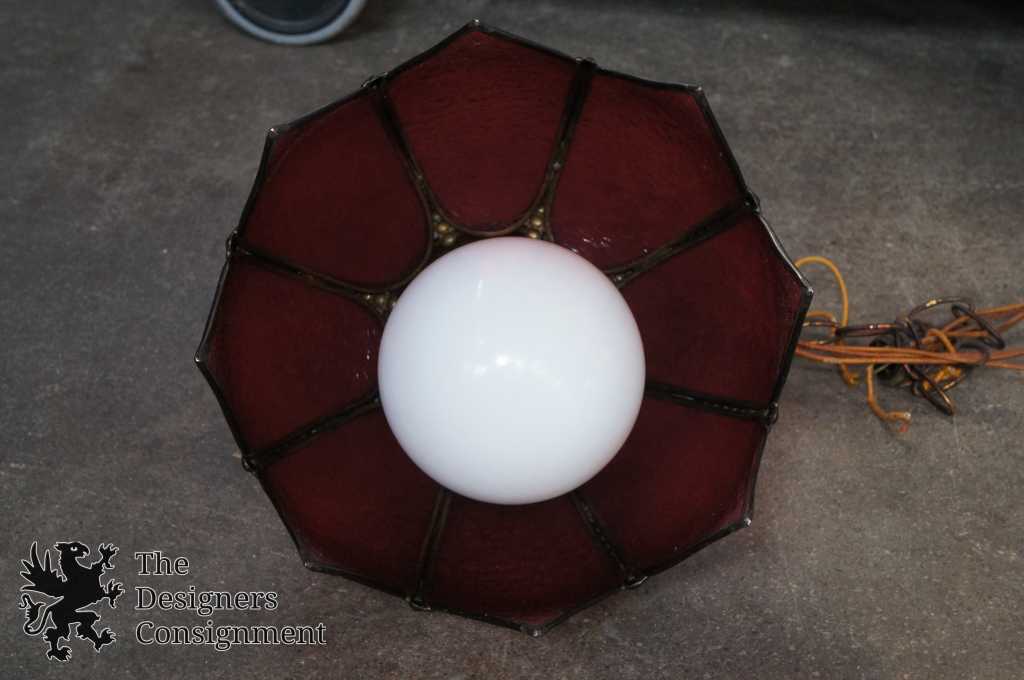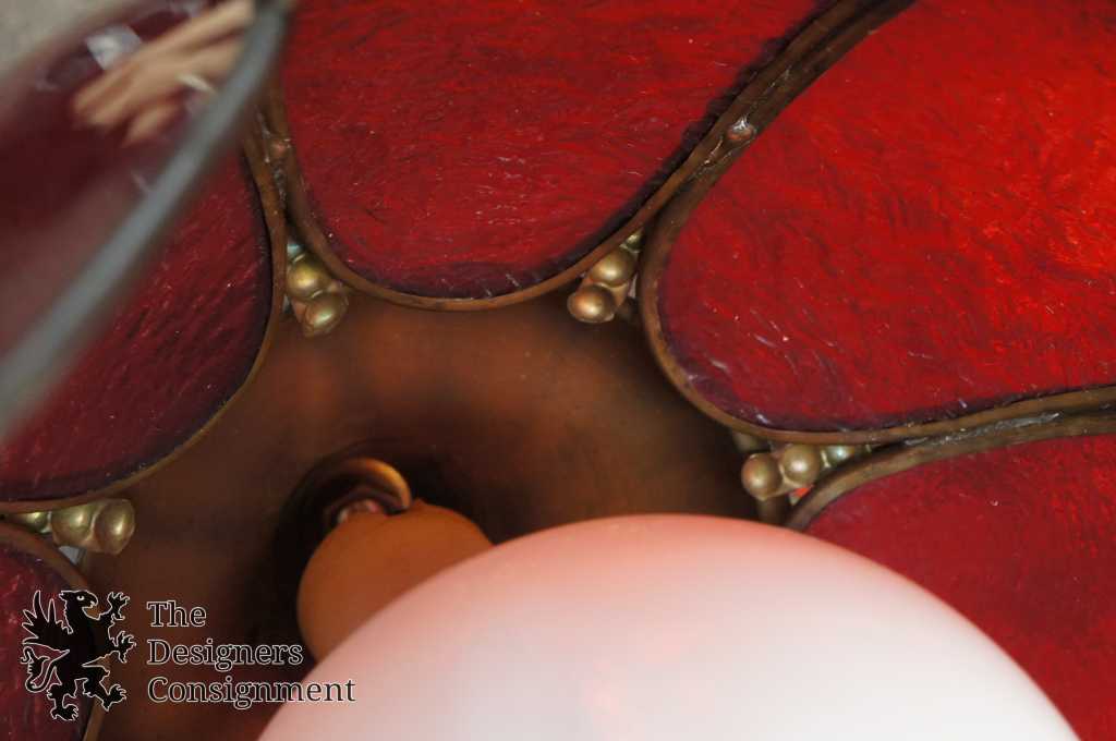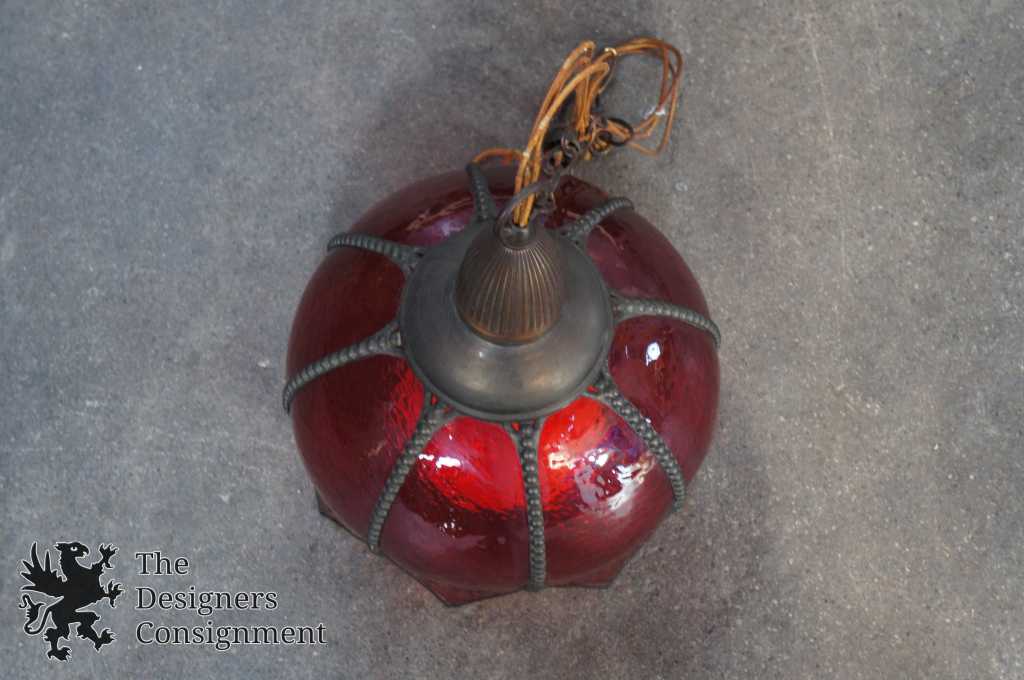 Mid Century Tulip Pedant light. Red slag glass with beaded brass design.