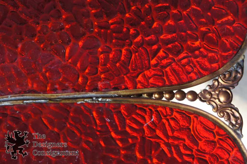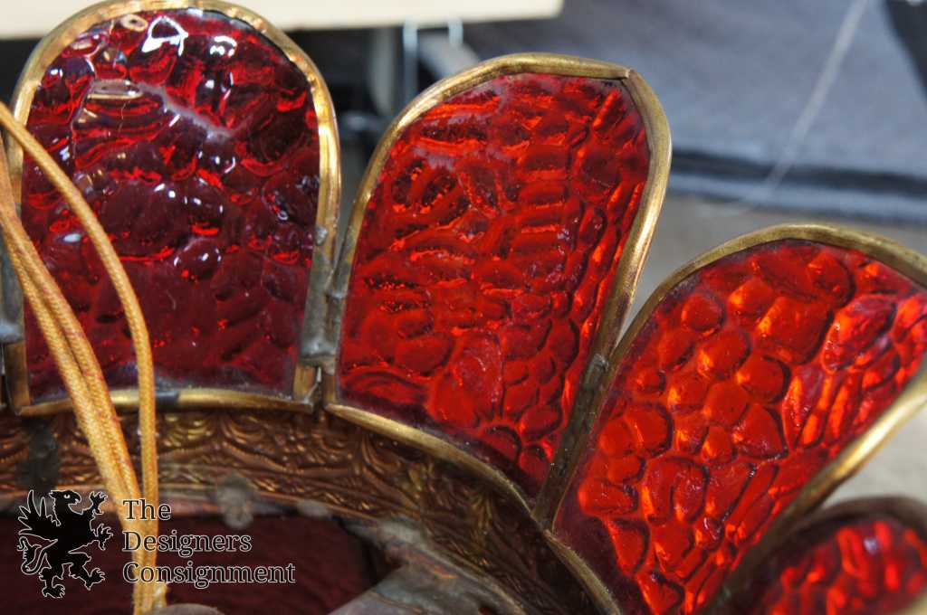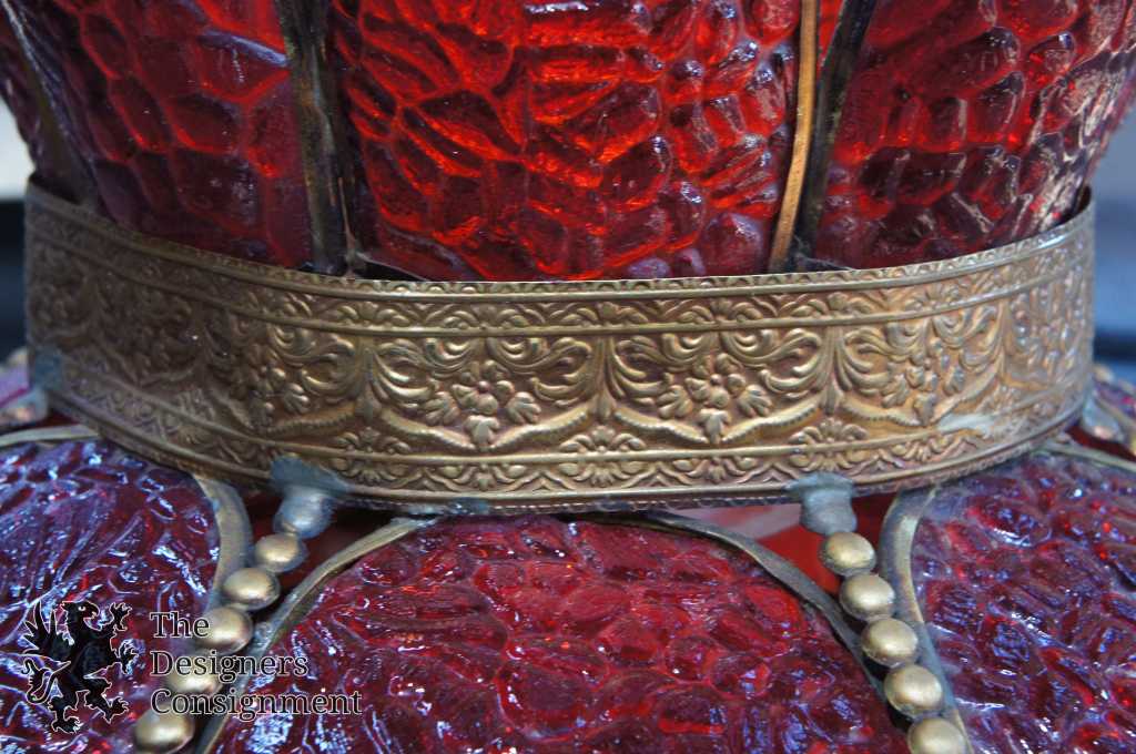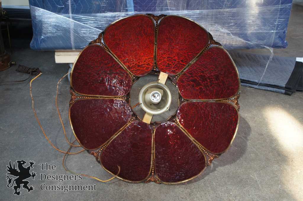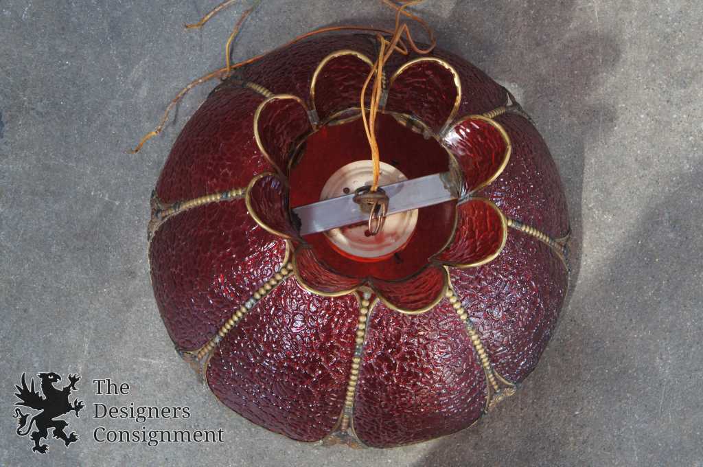 A neat mid century glass tulip light. Features red pebbled panels with beaded floral trim. This chandelier was in use at the Oakwood, Club in Dayton, Ohio upon opening in 1962.