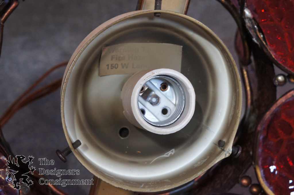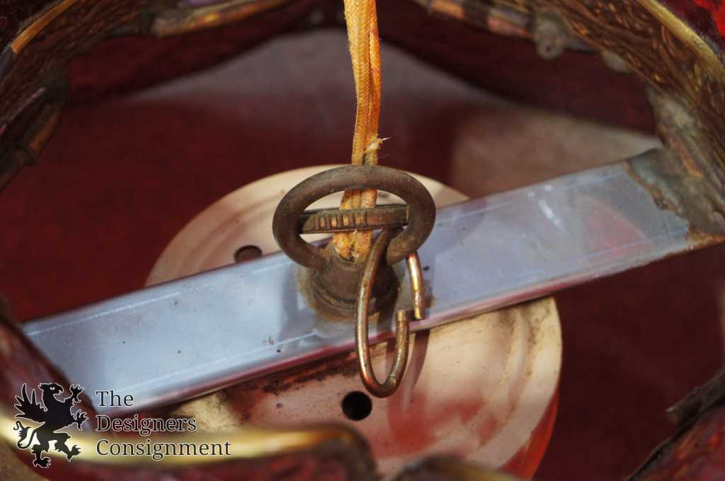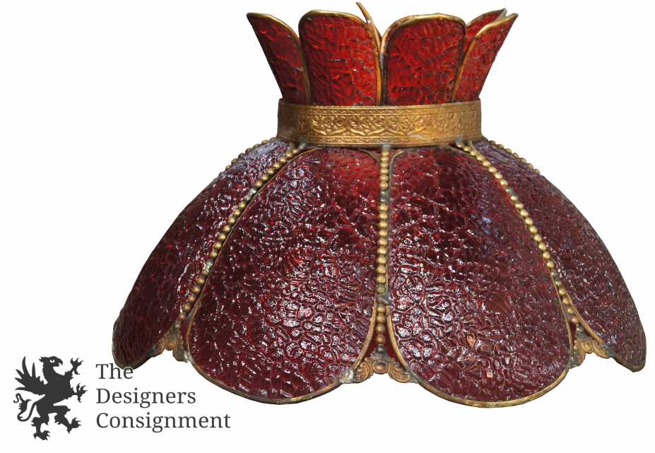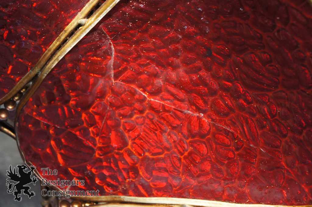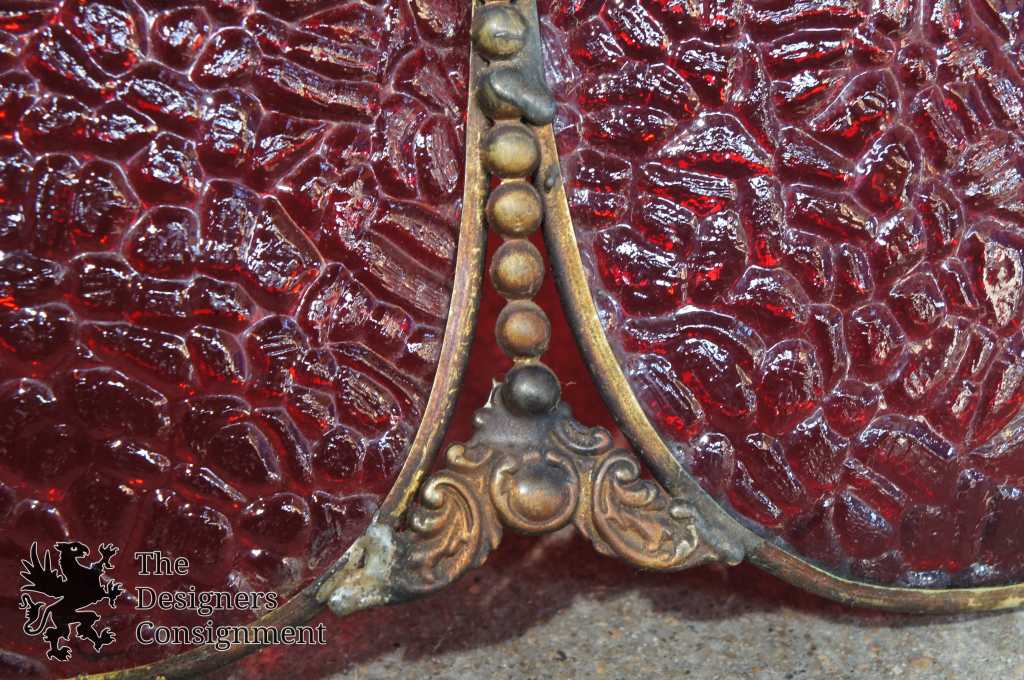 A neat mid century glass tulip light. Features red pebbled panels with beaded floral trim. This chandelier was in use at the Oakwood, Club in Dayton, Ohio upon opening in 1962.