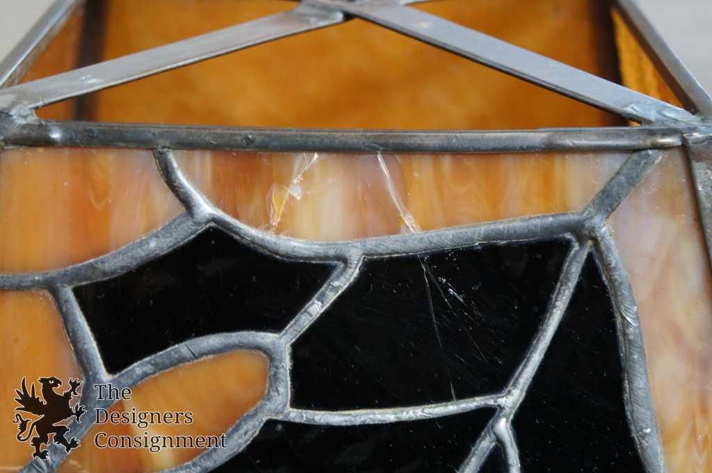 A beautiful set of stained art glass shades. Each is Leaded with amber slag glass and feature a leaf pattern along the front. These were used as table lanterns over candles at the Oakwood Club in Dayton, Ohio. They are intended to be hung as pendant lights, but of course can be used in a variety of settings. A rare and hard to find set of 10 that will add character to any atmosphere.