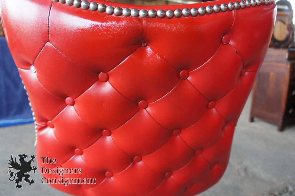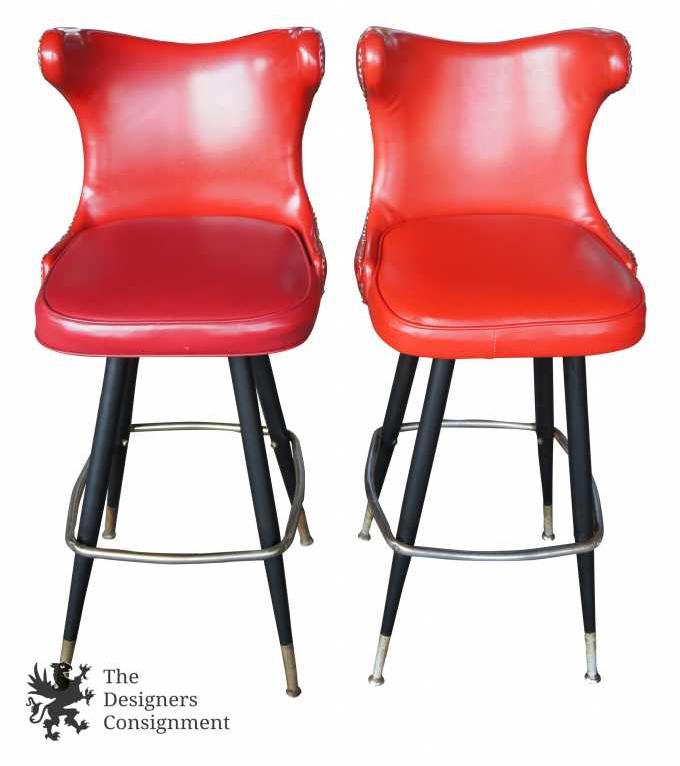 A beautiful pair of bar stools from the Oakwood Club in Dayton, Ohio. These were some of the first stools that sat around the bar when they opened in 1962. Features a wing-back design with tufting. Upholstered in a red leather with nail head trim, aluminum cast legs and a chrome foot rest. The chairs swivel. A neat addition to any collection