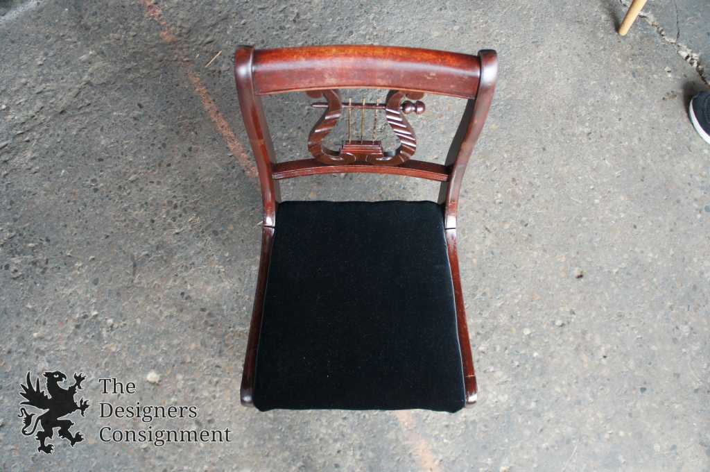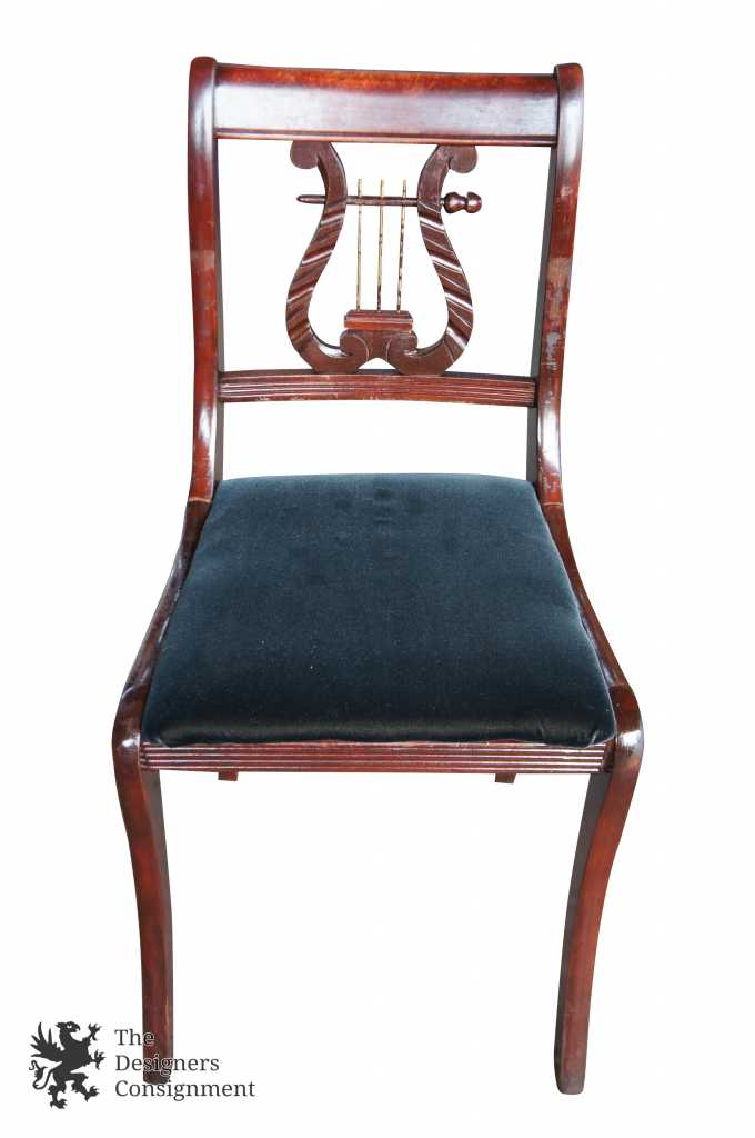 Antique mahogany harp back dining chair. Features velvet seat and saber legs.
