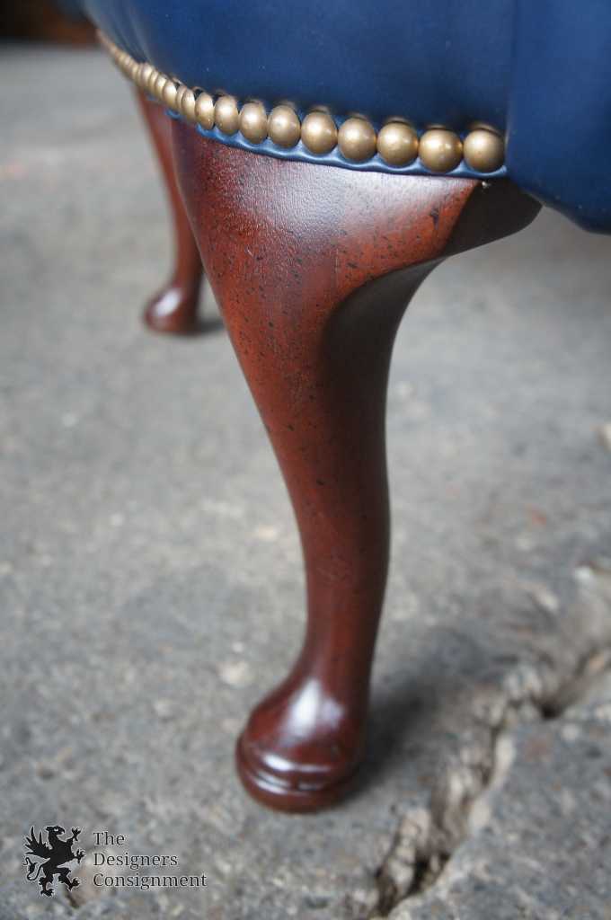 Classic Leather, Inc navy blue wing back chair. Queen Anne styling with a Navy Blue tufted upholstery and a Mahogany finish. Classic Leather inc has been in business since 1966 using top grain out of North Carolina. This is a gorgeous chair that will look great in any setting.