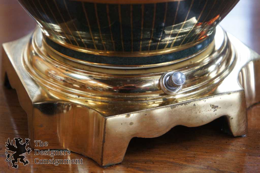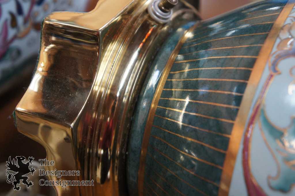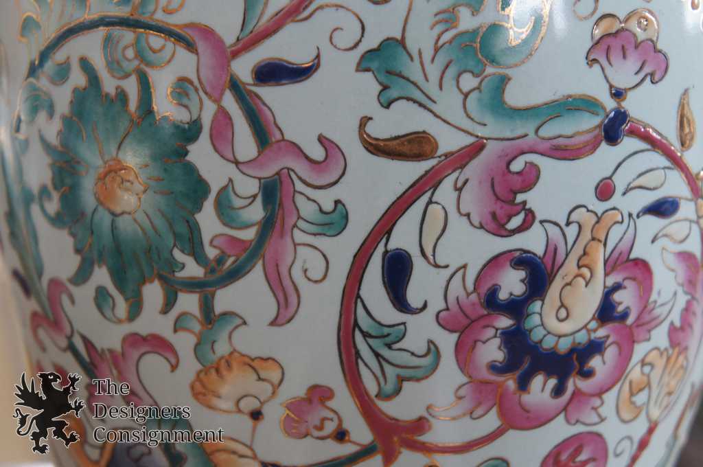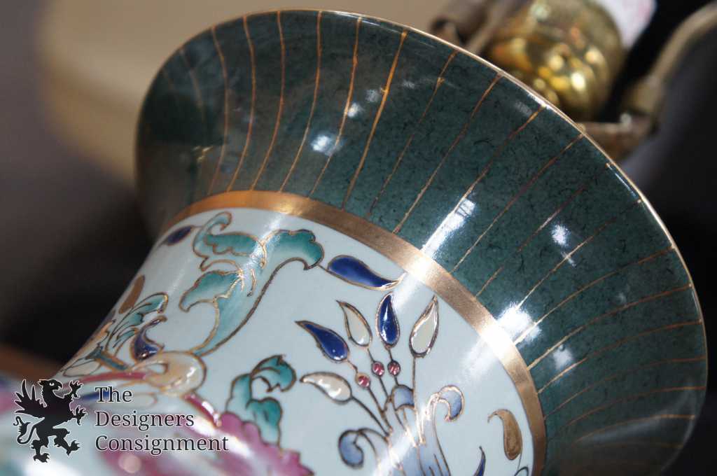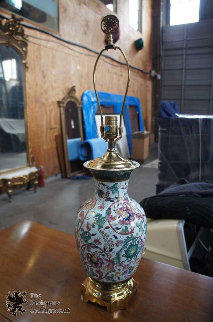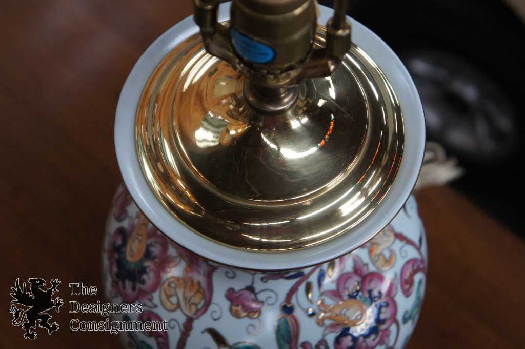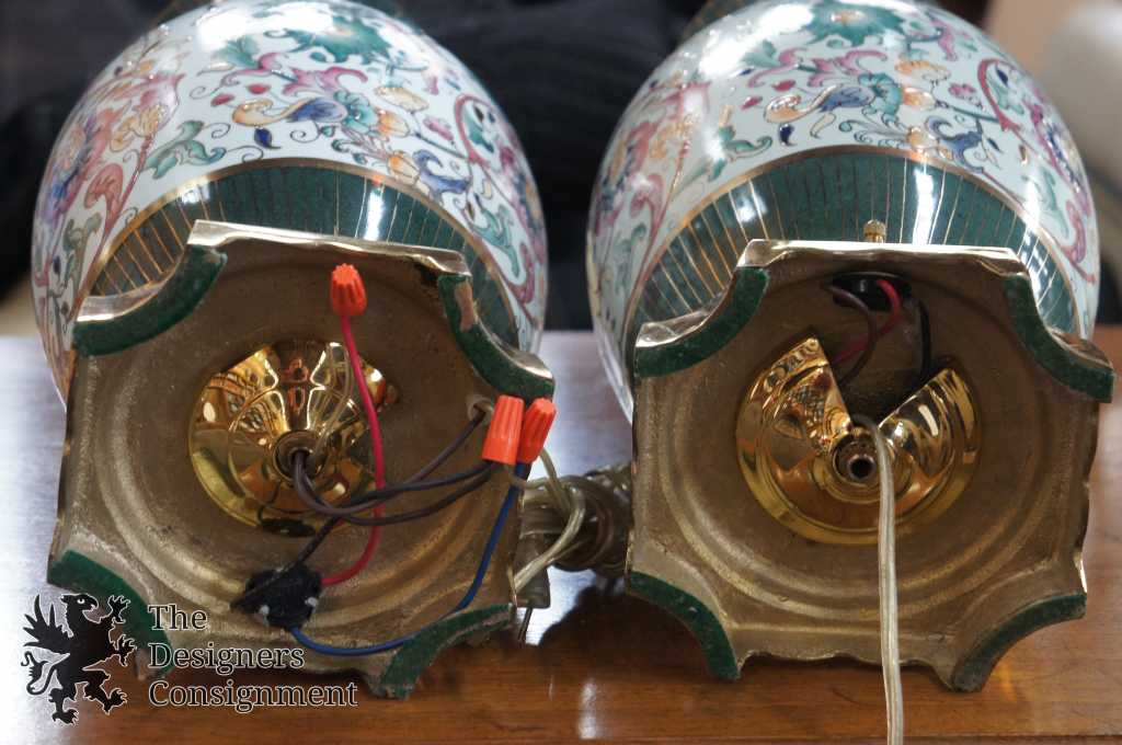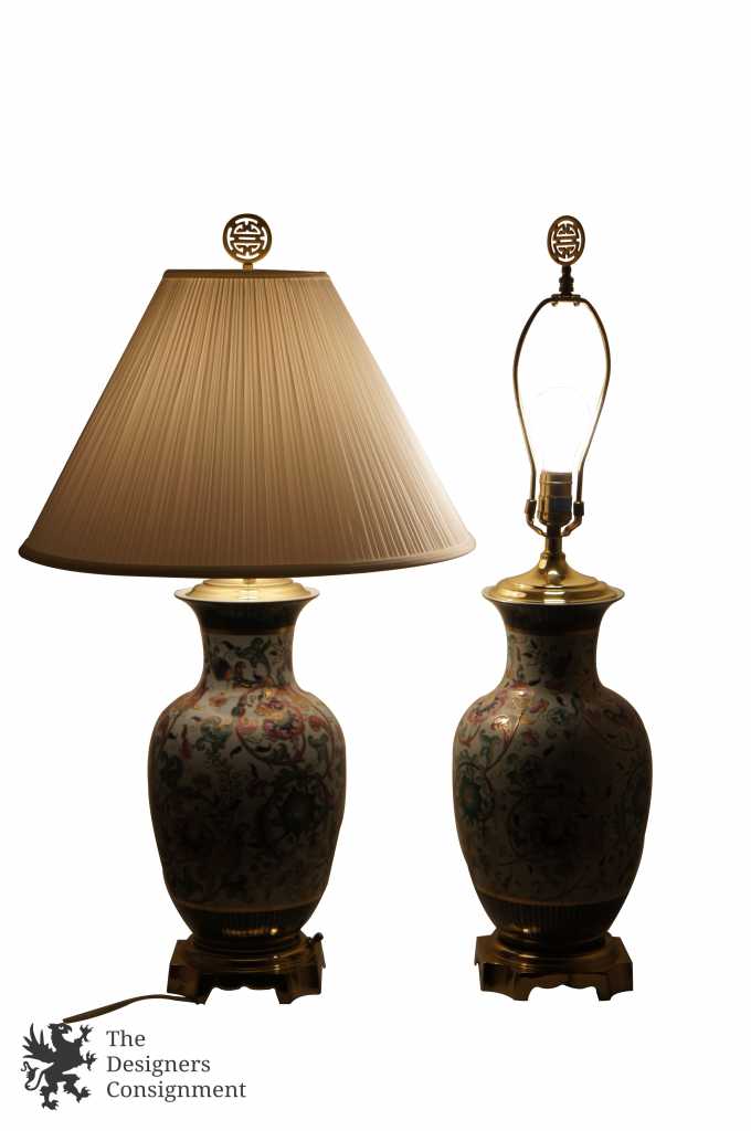 A beautiful pair of urn shaped porcelain lamps. Japanese Satsuma style with beautiful floral painted accents. Mounted on a brass base with lower switch. The optional shades for these lamps are pleated and linen.