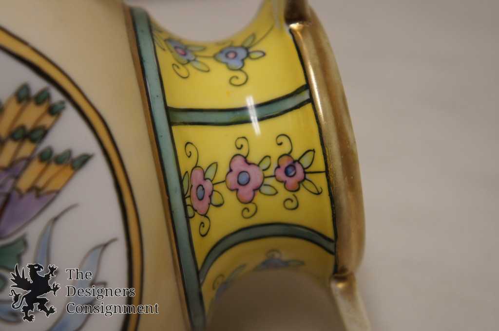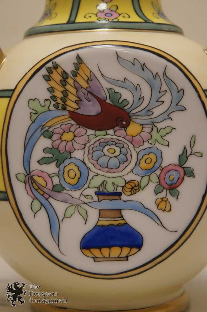 Nippon decorative vase. Tri-handled with hand painted floral detail. At the center a bird can be seen. a neat accent to any setting.